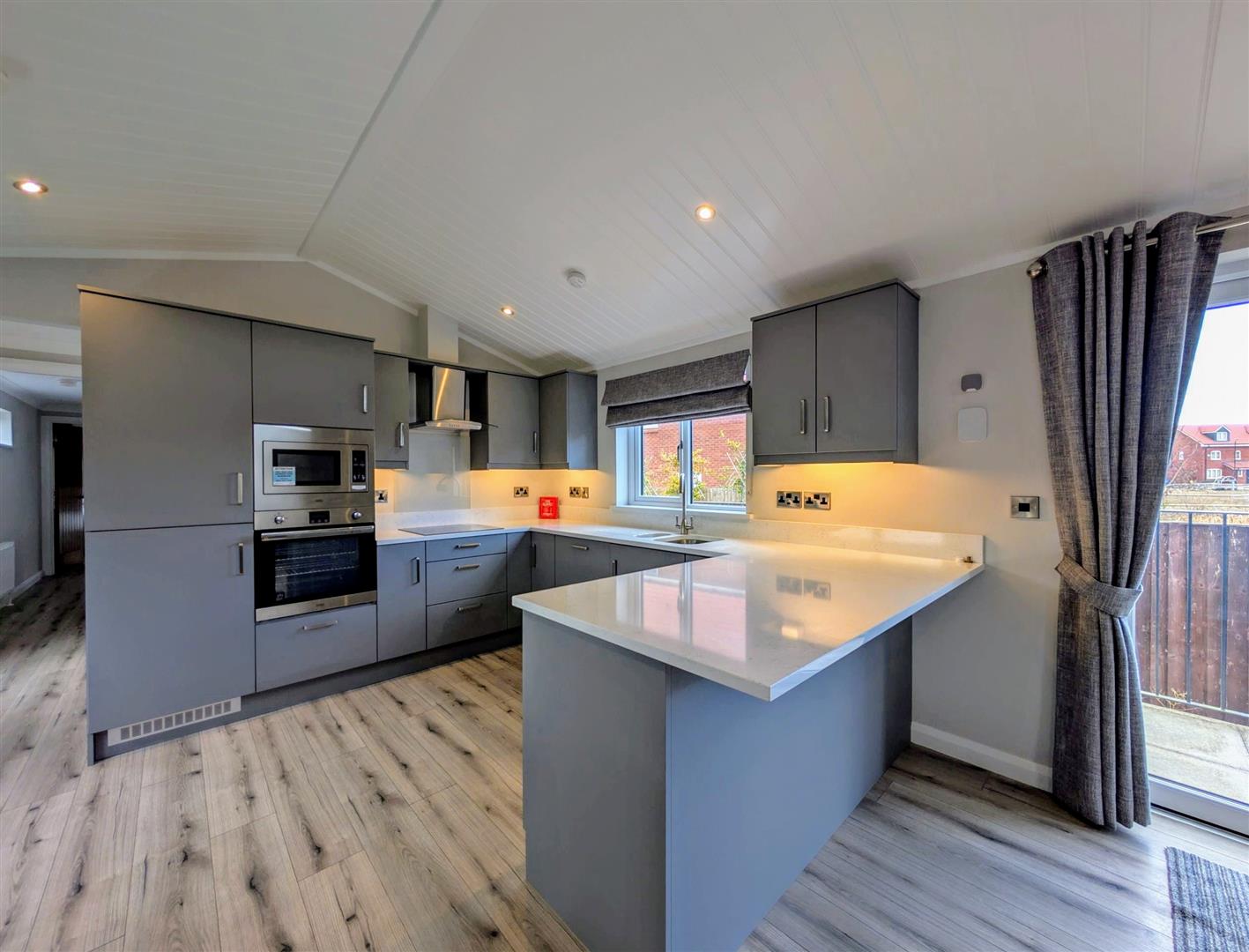 Kitchen Area: A range of base and wall mounted units, quartz worktop, one and a half bowl single drainer sink unit with a mixer tap, built in ceramic hob, electric oven, microwave combination cooker, built in dishwasher, built in fridge/freezer, single radiator, downlightes, upvc double glazed windows to front and rear elevations.