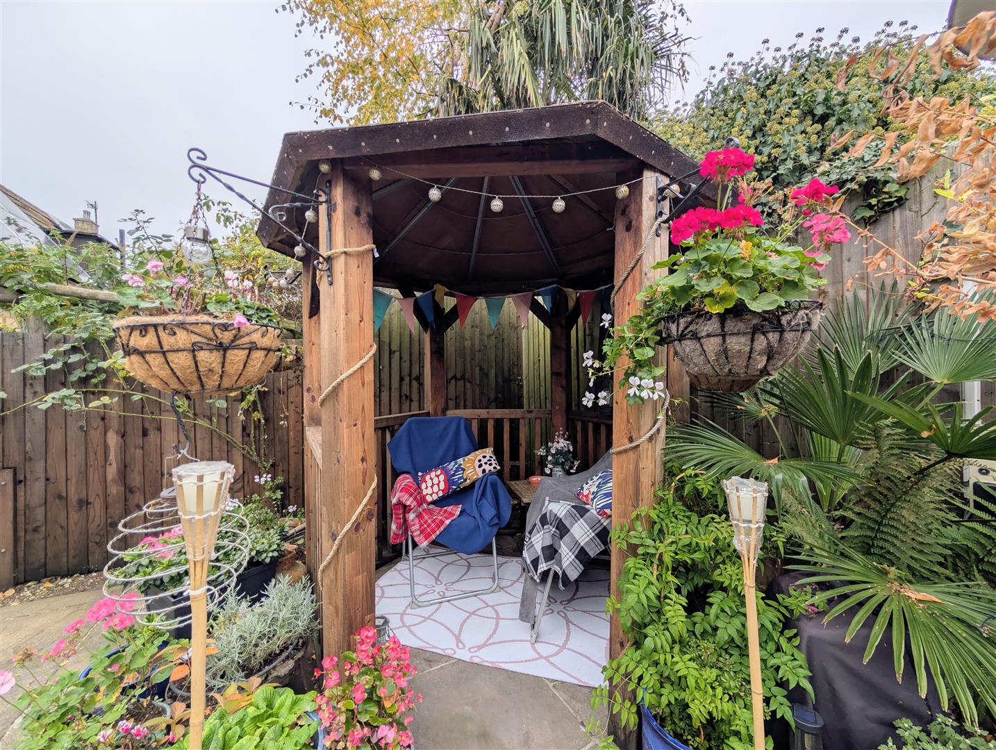 To the rear there is a paved patio with flower borders, plants and bushes, also a lawn with further plants, shrubs, bushes and trees, wooden built garden shed and all is enclosed by panelled fencing.