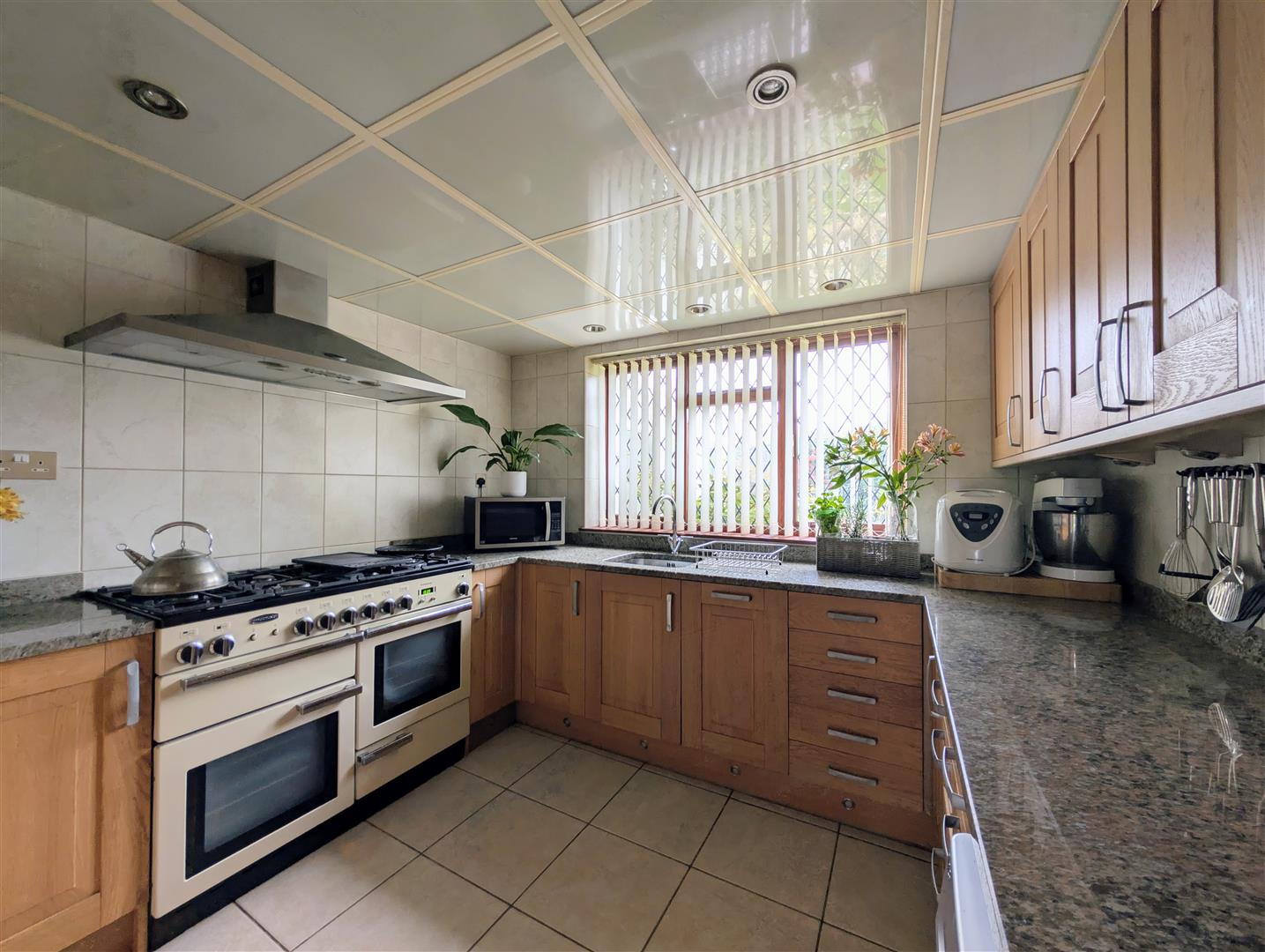Kitchen - 2.97m x 2.95m (9'9 x 9'8) - Oak fronted base and wall mounted units, granite worktops and splashbacks, single bowl sink unit with a chrome mixer tap, plumbing for automatic washing machine, fully tiled walls, tiled floor, downlighters, built in fridge, double glazed window to rear elevation.