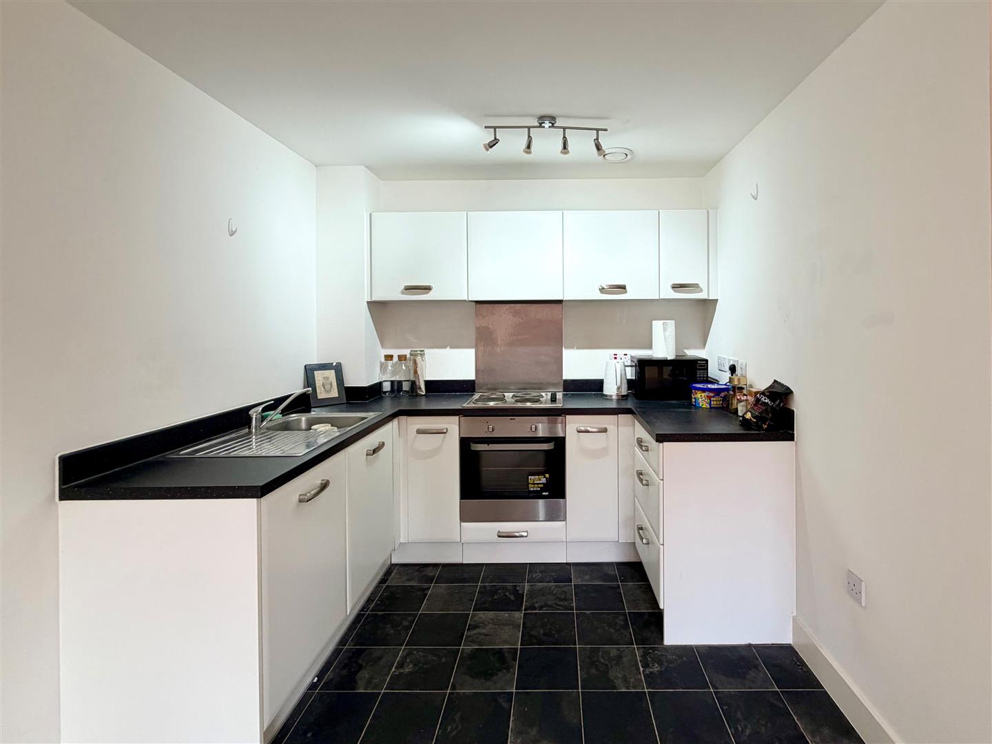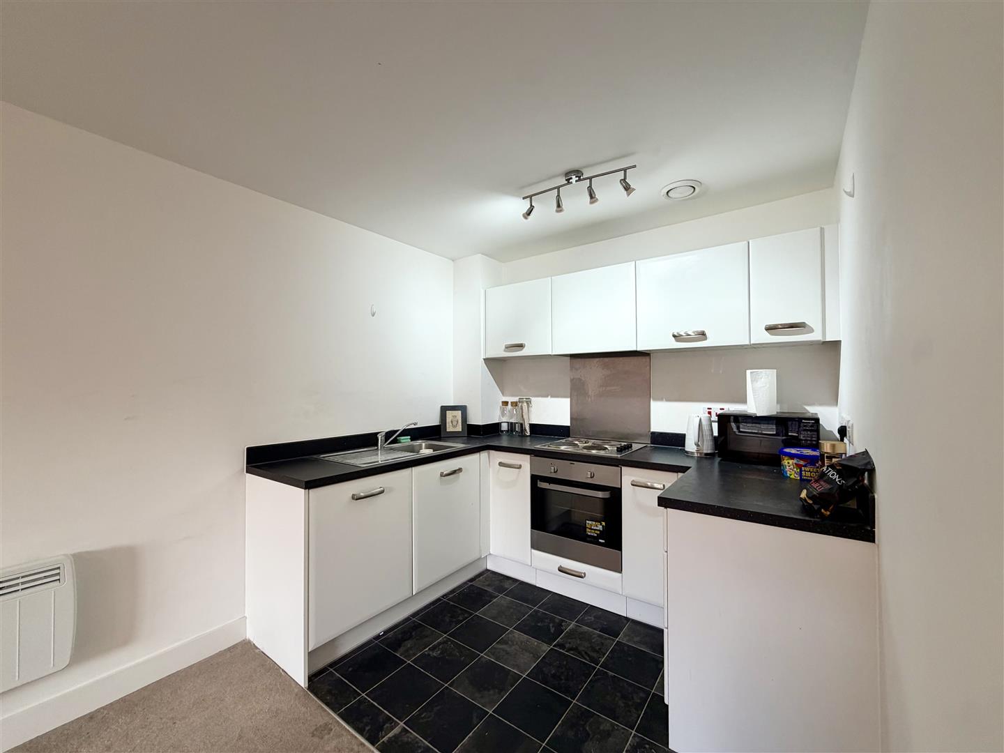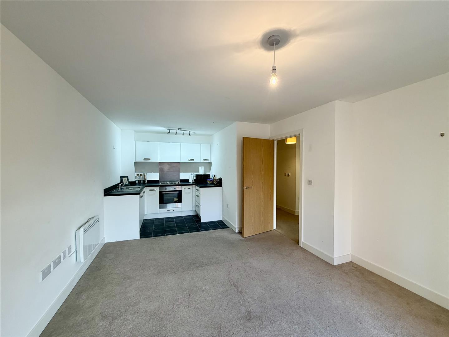 Open Plan Kitchen/Diner/Living Room - 6.68m x 3.70m max (21'10" x 12'1" max) - White kitchen with base, drawer and wall mounted units, worktop, electric hob, electric oven, extractor hood, stainless steel sink and drainer with a mixer tap, space for fridge/freezer, electric heaters, power points, tv point, upvc double glazed door leading to a Juliet balcony to rear elevation.