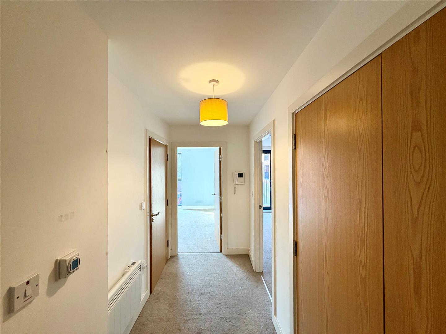 Entrance Hallway - Storage cupboard with double doors housing the hot water tank, plumbing for washing machine and ventaxia air filtration hub, electric heater, power points, intercom system, various doors leading off.