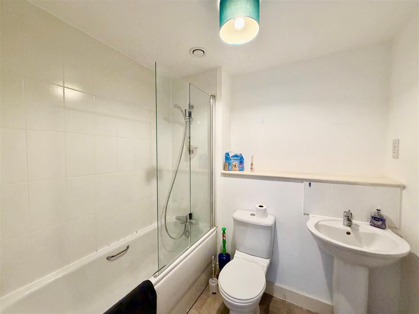 Bathroom - White suite comprising bath with shower unit over, low level w.c., pedestal wash hand basin with a mixer tap, shaver point, electric heated towel rail.
