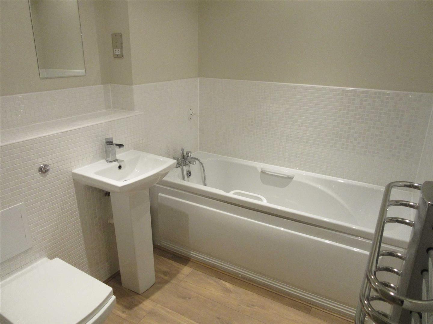 Bathroom - 2.08m x 1.88m (6'10 x 6'2) - White suite comprising close coupled w.c., pedestal wash hand basin with a mixer tap, bath with a mixer tap and shower over, half tiled walls, chrome heated towel rail, extractor fan, spotlights, shaver point.