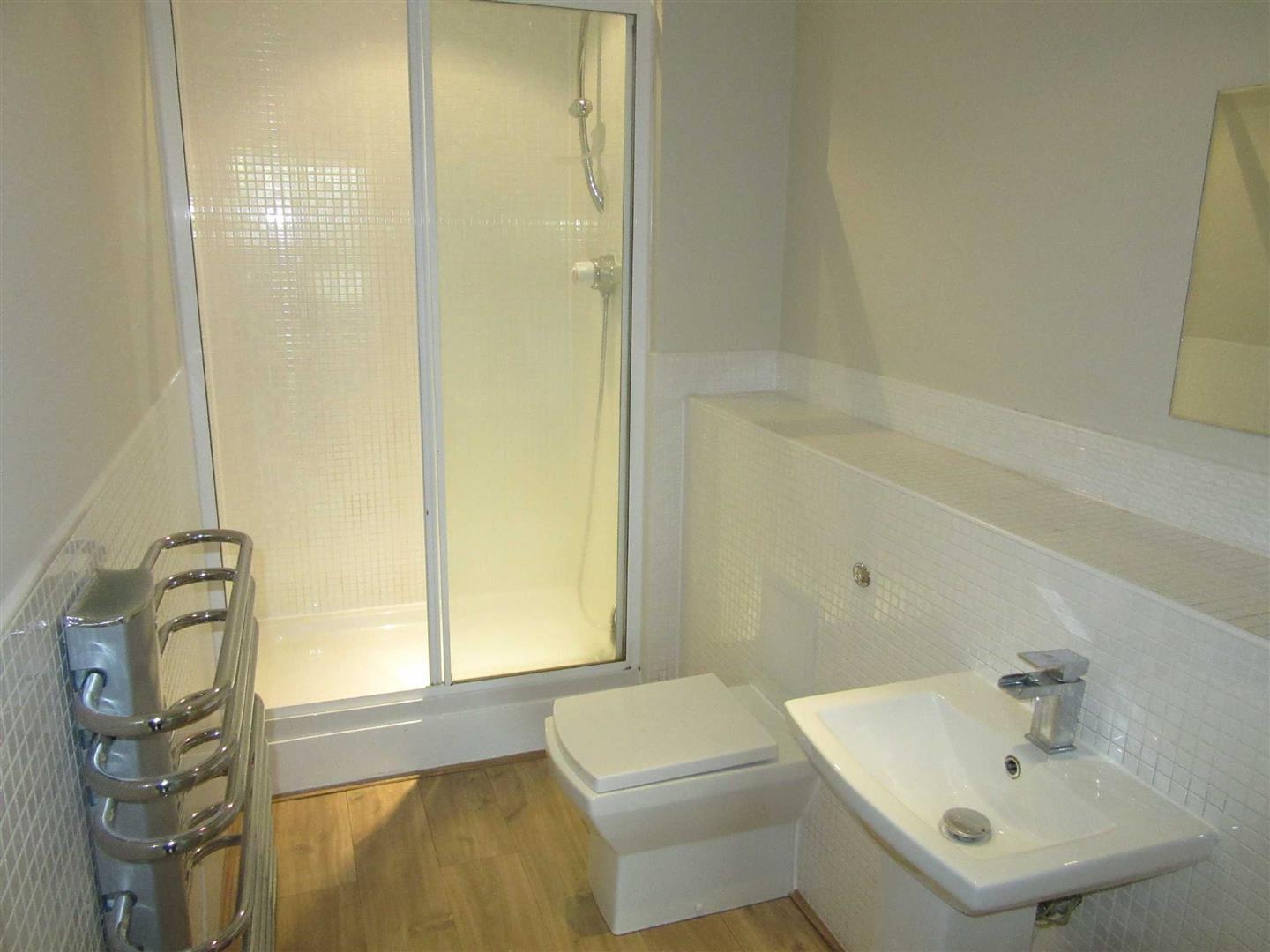 En-Suite Shower Room - 2.82m x 1.55m (9'3 x 5'1) - White suite comprising pedestal wash hand basin with a mixer tap, close coupled w.c., double walk in shower unit, tiled floor, part tiled walls, chrome heated towel rail, extractor fan, shaver point and spotlights.