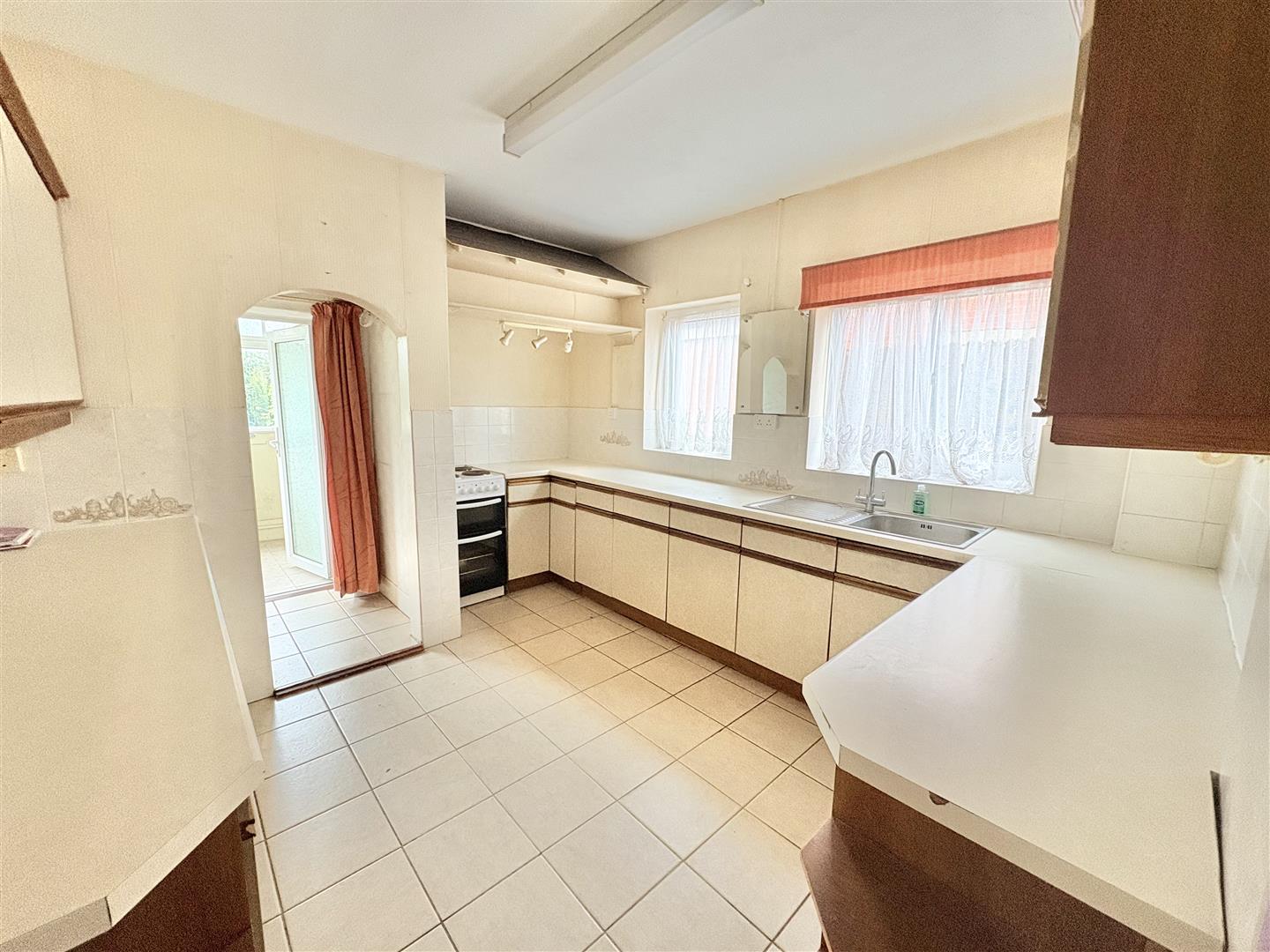 Kitchen - 3.93m x 3.25m (12'10" x 10'7") - A range of base, drawer and wall mounted units, roll edge worksurface, stainless steel sink and drainer unit with mixer tap over, tiled splashbacks, wall mounted Alfo boiler supplying domestic hot water and central heating, space for cooker, tiled flooring, aluminium double glazed window to side aspect, upvc double glazed window to side aspect, upvc opaque door and wooden opaque glazed window into: