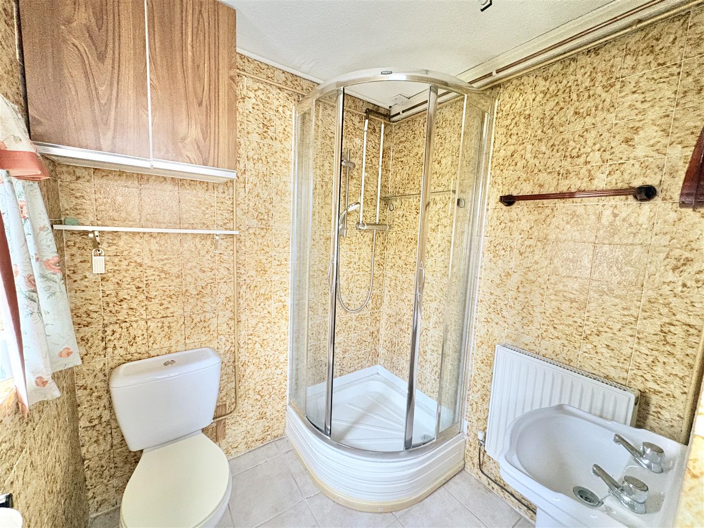 Downstairs Shower Room - Pedestal wash hand basin, corner shower cubicle, low level w.c., radiator, tiled flooring, upvc double glazed window to side aspect.