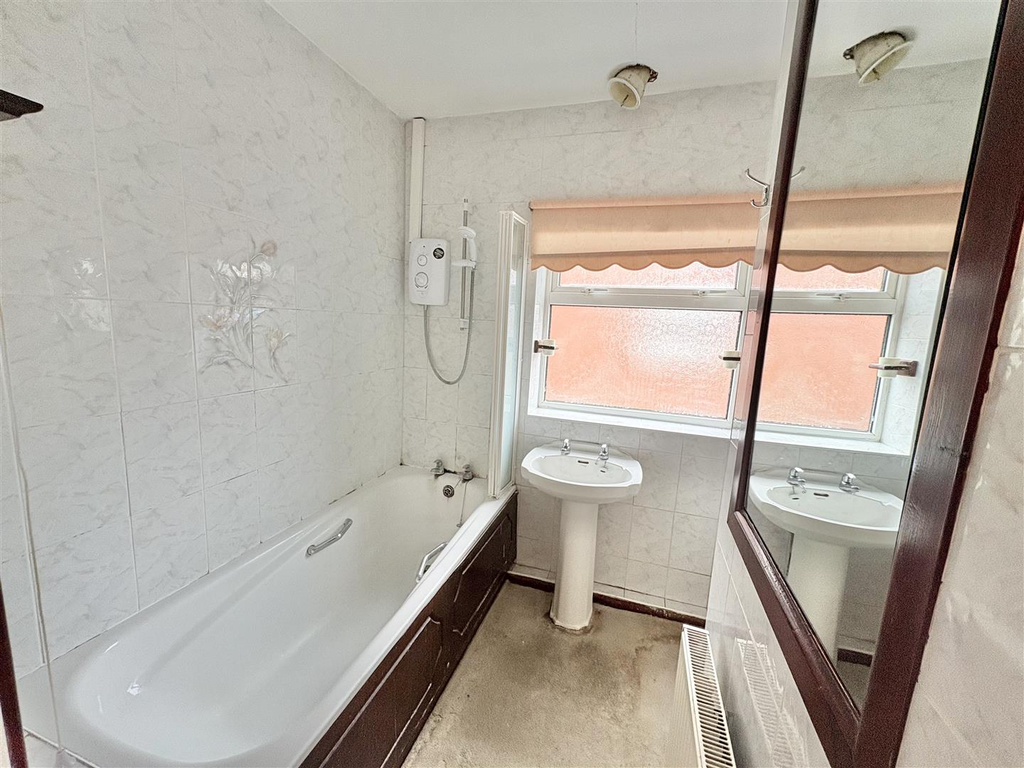 Bathroom - White suite comprising low level w.c., pedestal wash hand basin, bath with electric shower over, part tiled walls, radiator, mirror fronted door gives access to the airing cupboard with slatted shelving, white upvc opaque glazed window to side aspect.