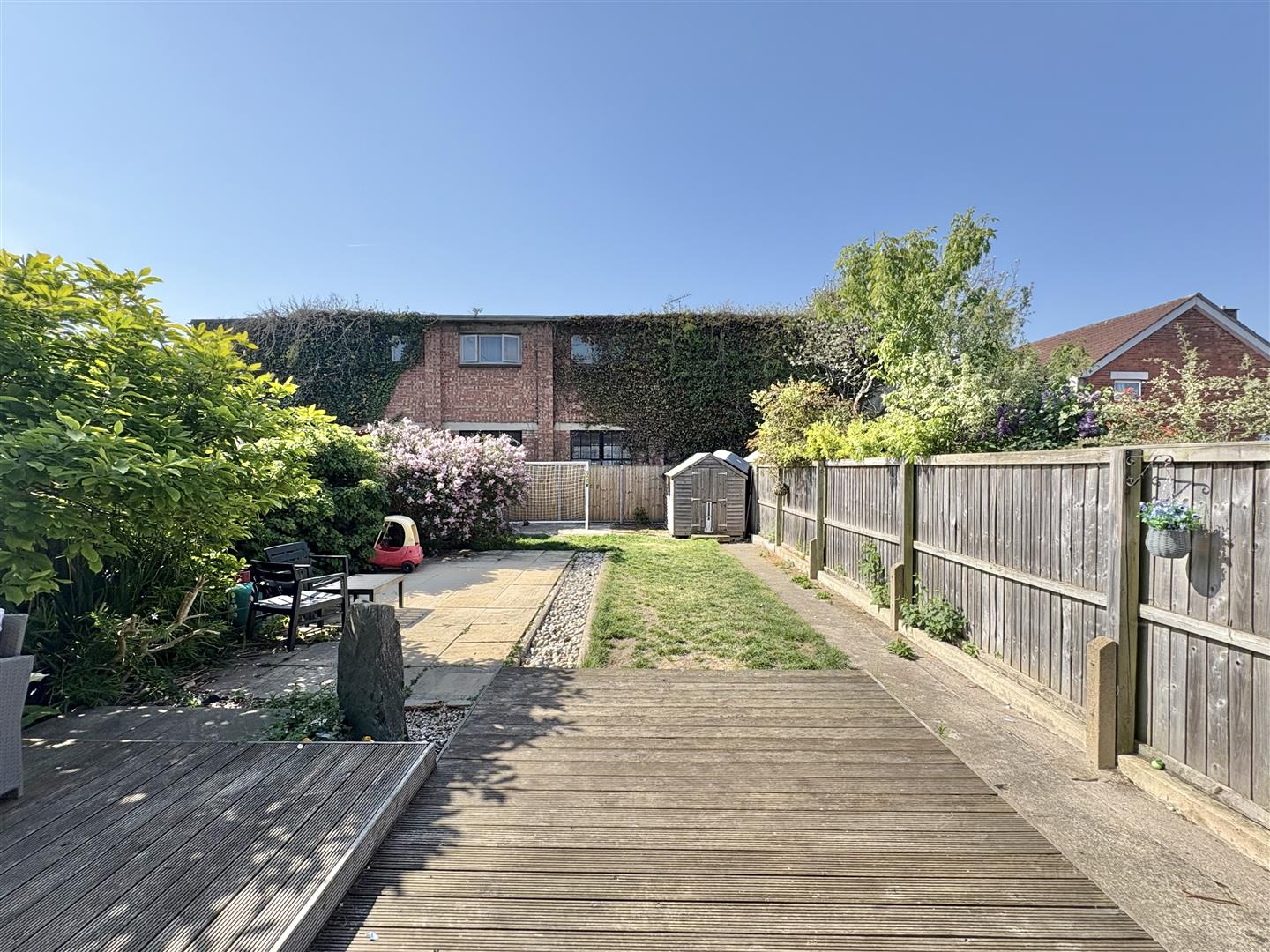 There is gated side access leading to the rear garden which measures approaching 60ft in length and is primarily laid to lawn with mature trees, shrubs, bushes, large decked area, timber storage shed and is all enclosed by close board timber panel fencing.