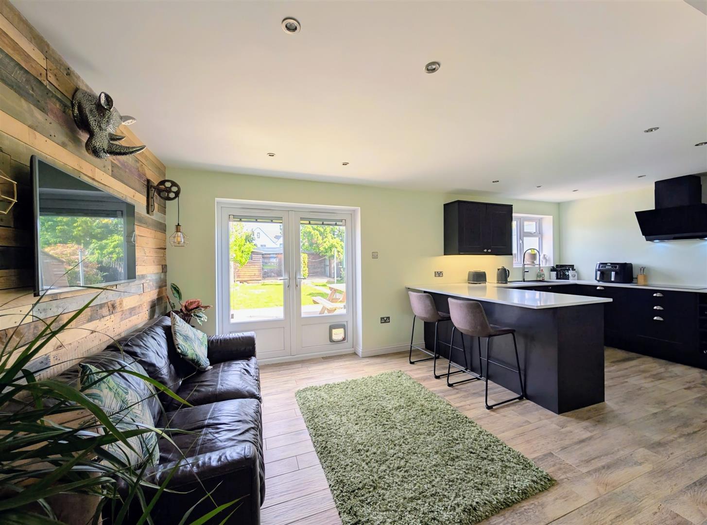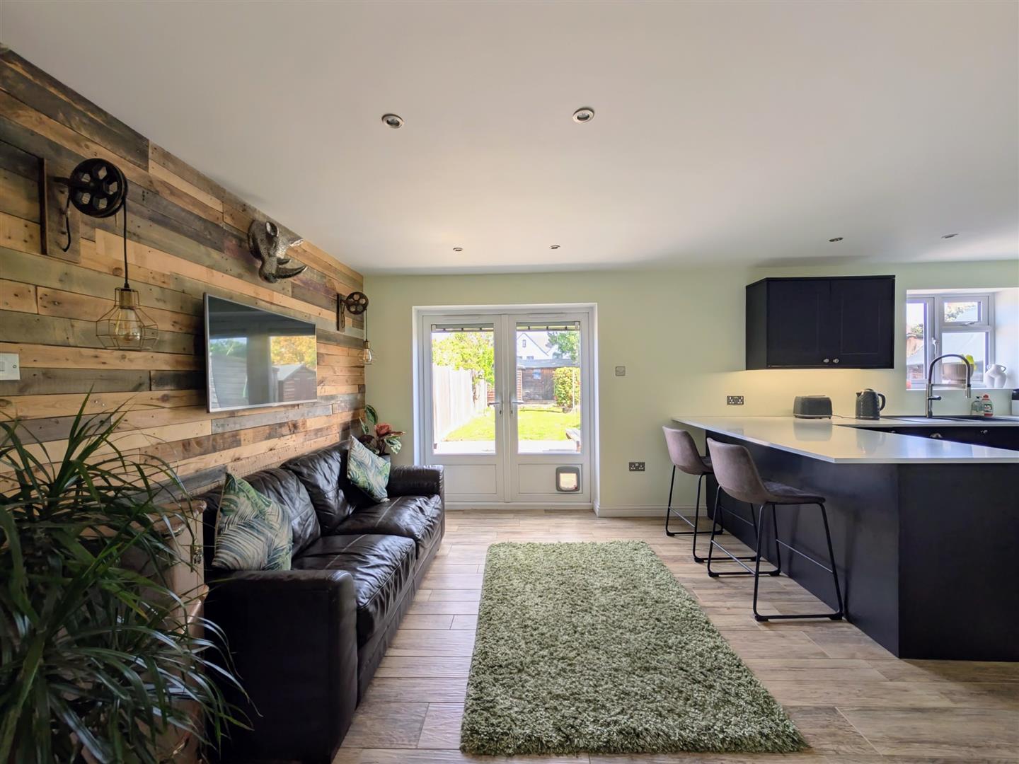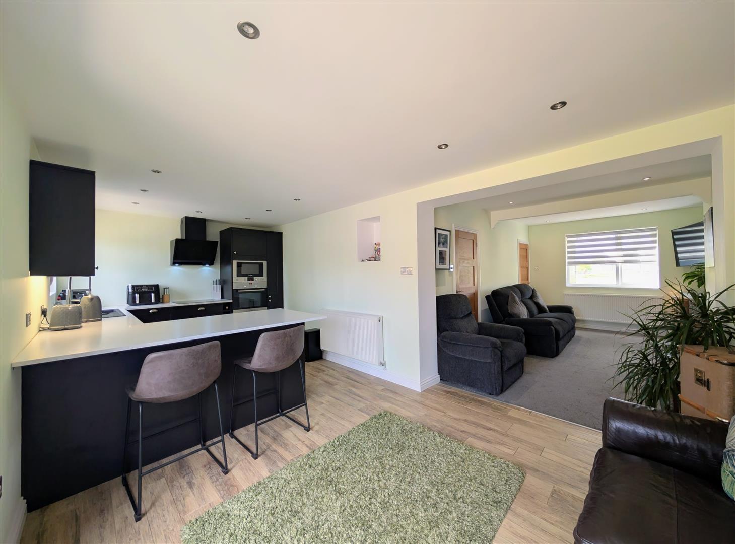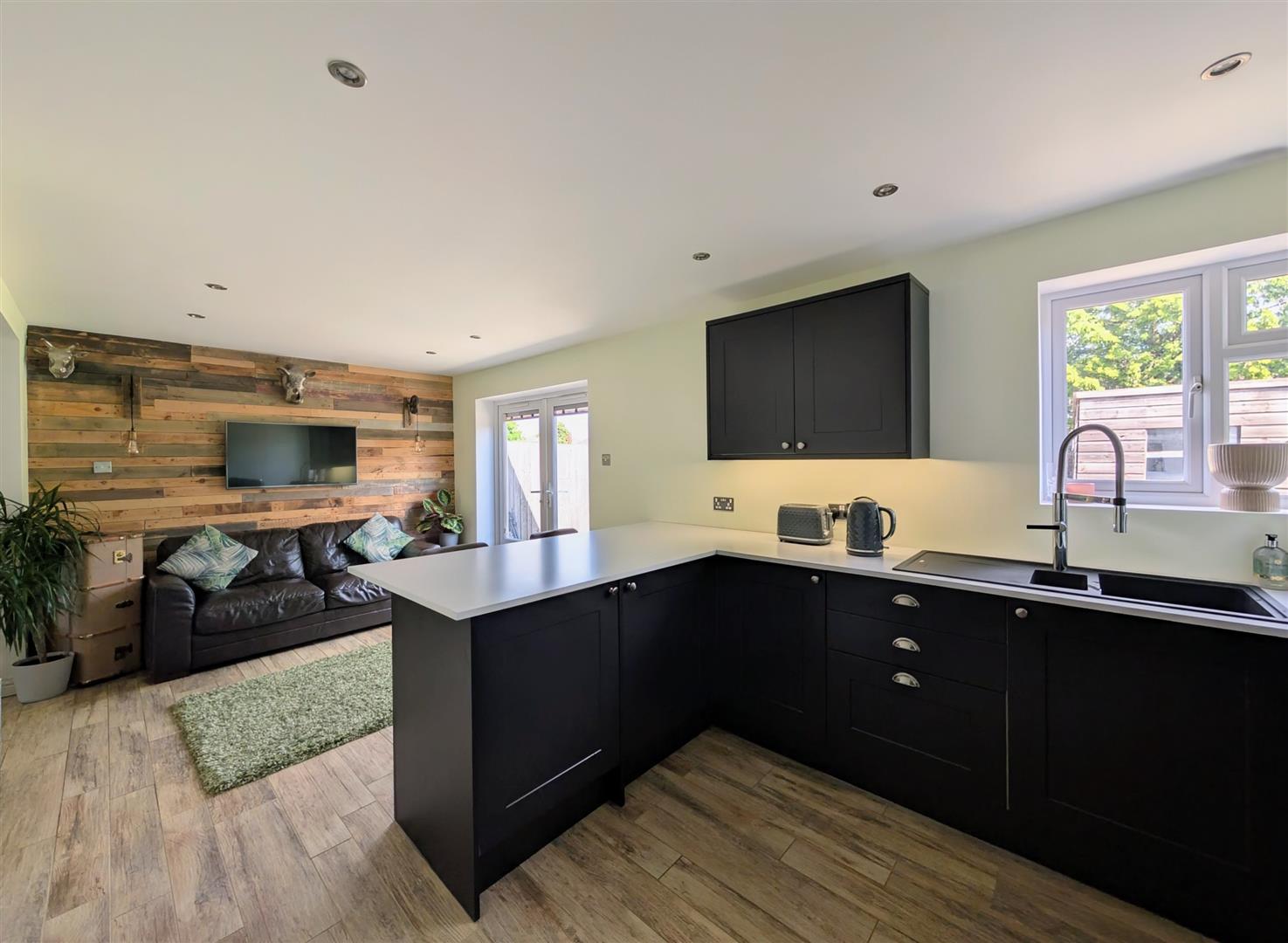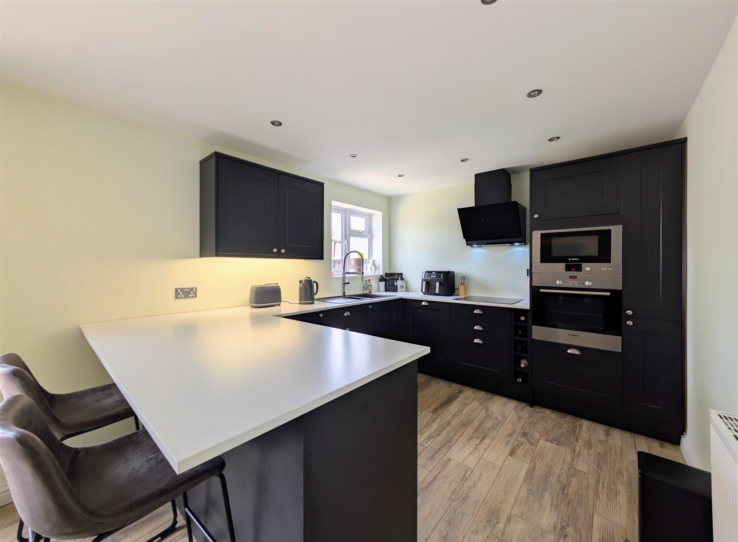 Kitchen/Diner - 6.22m x 2.90m (20'5 x 9'6) - Newly fitted base and wall mounted units, laminated worktop, single drainer one and a half bowl sink unit with a chrome mixer tap, built in induction hob with extractor over, built in electric oven, microwave, dishwasher, fridge and freezer, breakfast bar, tiled floor, double radiator, downlighters, upvc double glazed window and matching French doors to rear elevation onto the patio.