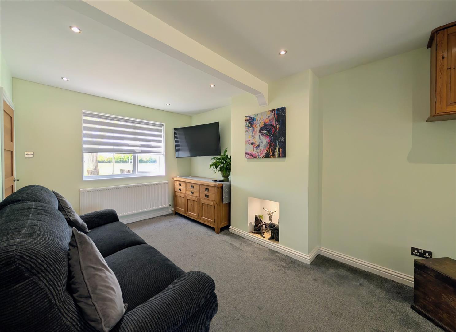 Lounge - 4.93m x 2.97m max (16'2 x 9'9 max) - Former open fireplace, single radiator, downlighters, tv point, upvc double glazed window to front elevation overlooking the green, opening into: