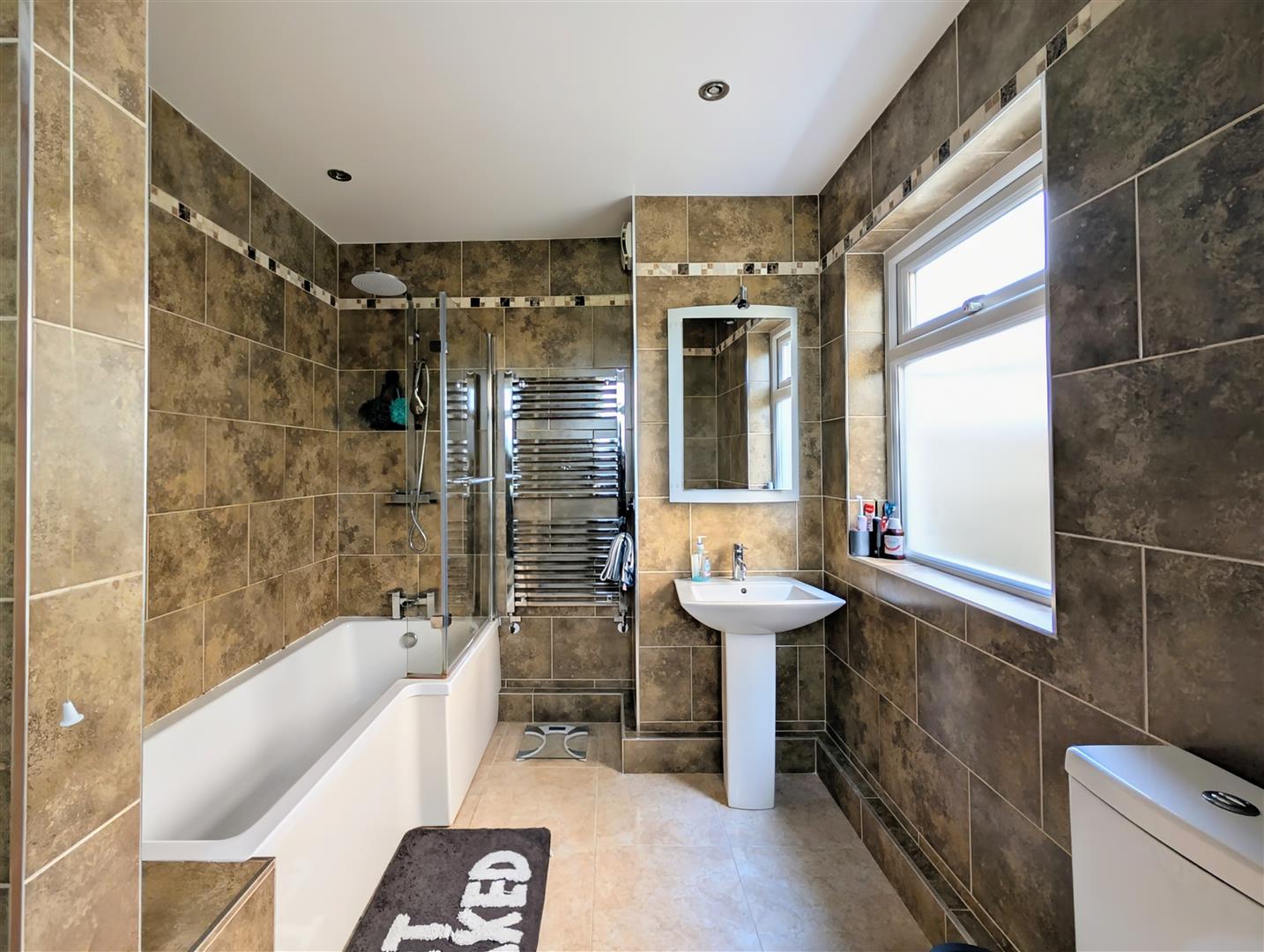 Bathroom - 3.05m x 2.26m max (10' x 7'5 max) - White suite comprising shower bath with a mixer tap and shower unit over, low level w.c., pedestal wash hand basin with a mixer tap, chrome heated towel rail, fully tiled walls, tiled floor, downlighters , extractor fan, cupboard housing the gas fired combination boiler with shelving. upvc double glazed windows to front and side elevations.