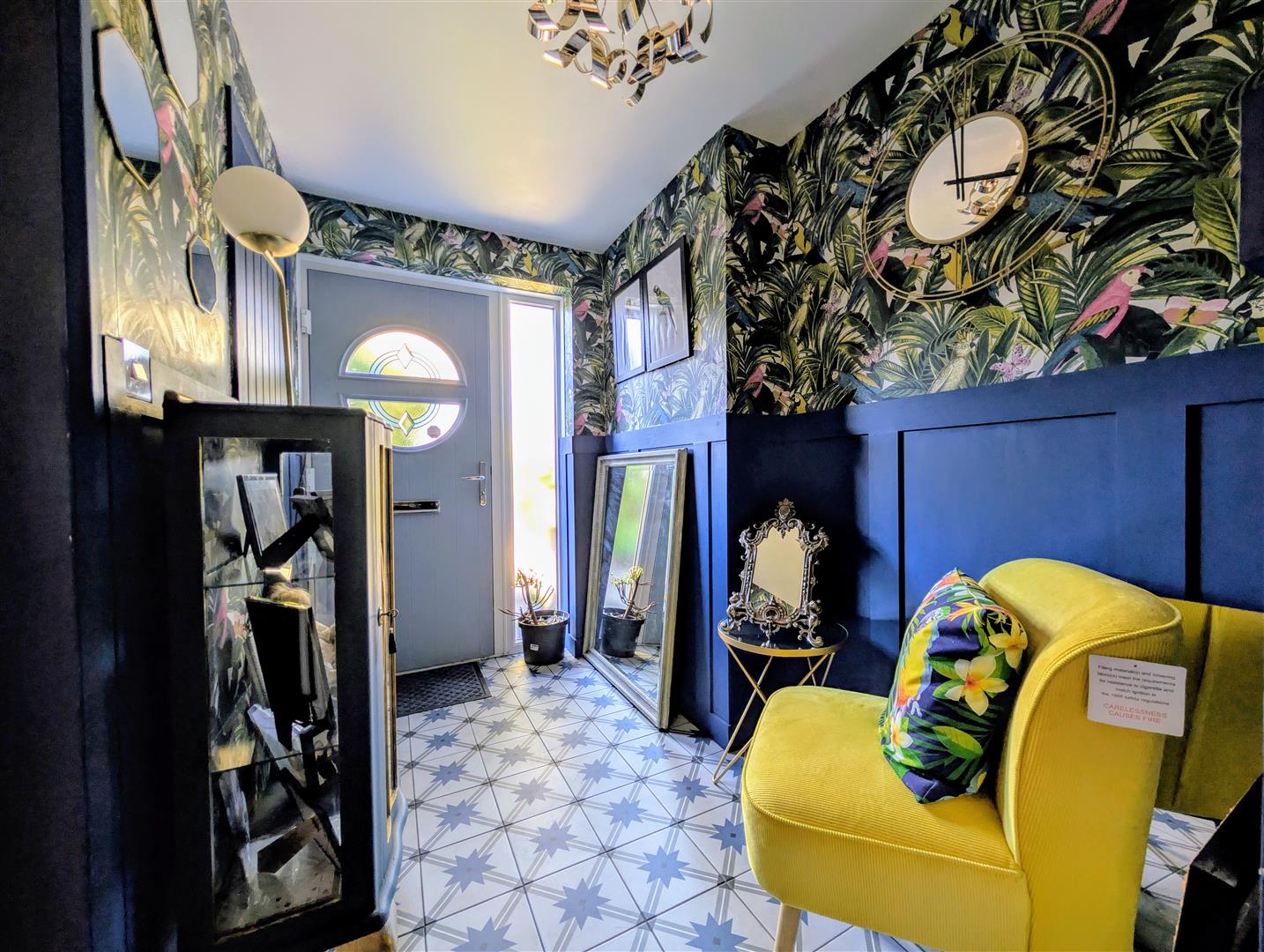Entrance Hallway - Ornate tiled floor, single radiator, built in cloaks cupboard with hanging space and shelving, a further built in storage cupboard with shelving.