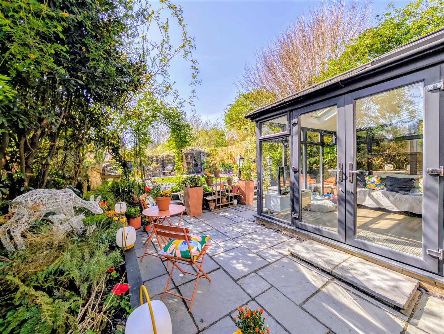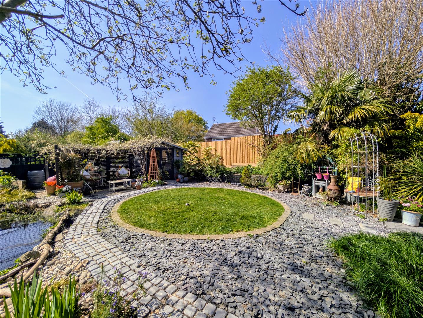There is access around both sides of the property with raised flower borders, plants, bushes and trees to the rear garden where there is a paved patio, raised flower borders, plants, shrubs and bushes. Steps then lead to the rest of the landscaped rear garden which has a circular lawn, shale surround, raised flower borders, plants, shrubs, bushes, a pond and a summerhouse.