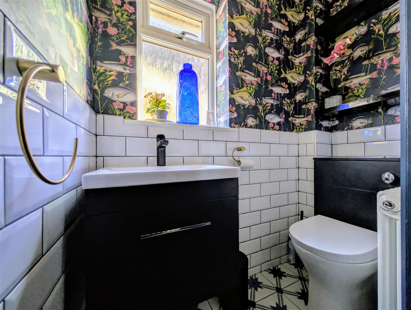 Cloakroom - 1.68m x 0.74m (5'6 x 2'5) - Low level w.c., wash hand basin with a mixer tap and drawer below, partially tiled walls, ornate tiled floor, radiator, upvc double glazed window to side elevation.