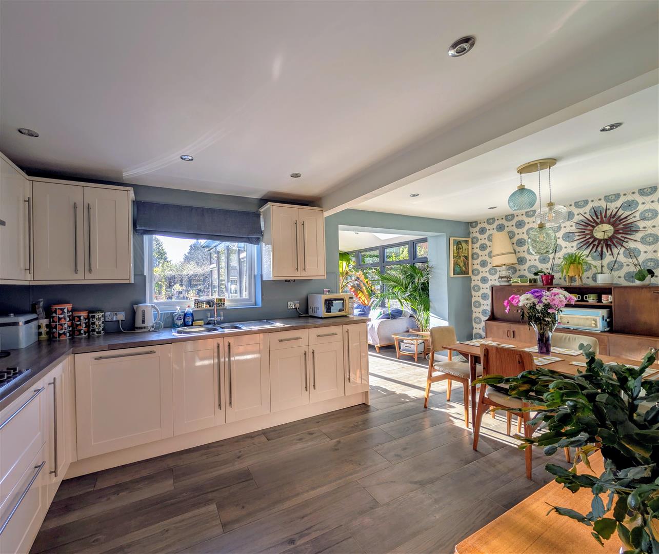 Kitchen/Diner - 5.89m x 2.95m (19'4 x 9'8) - Base and wall mounted units, laminated worktops, single drainer one and a half bowl stainless steel sink unit with a mixer tap, built in four burner gas hob, electric double oven, built in dishwasher, downlighters, vertical radiator, tiled floor, space for table and chairs, upvc double glazed window to rear elevation.