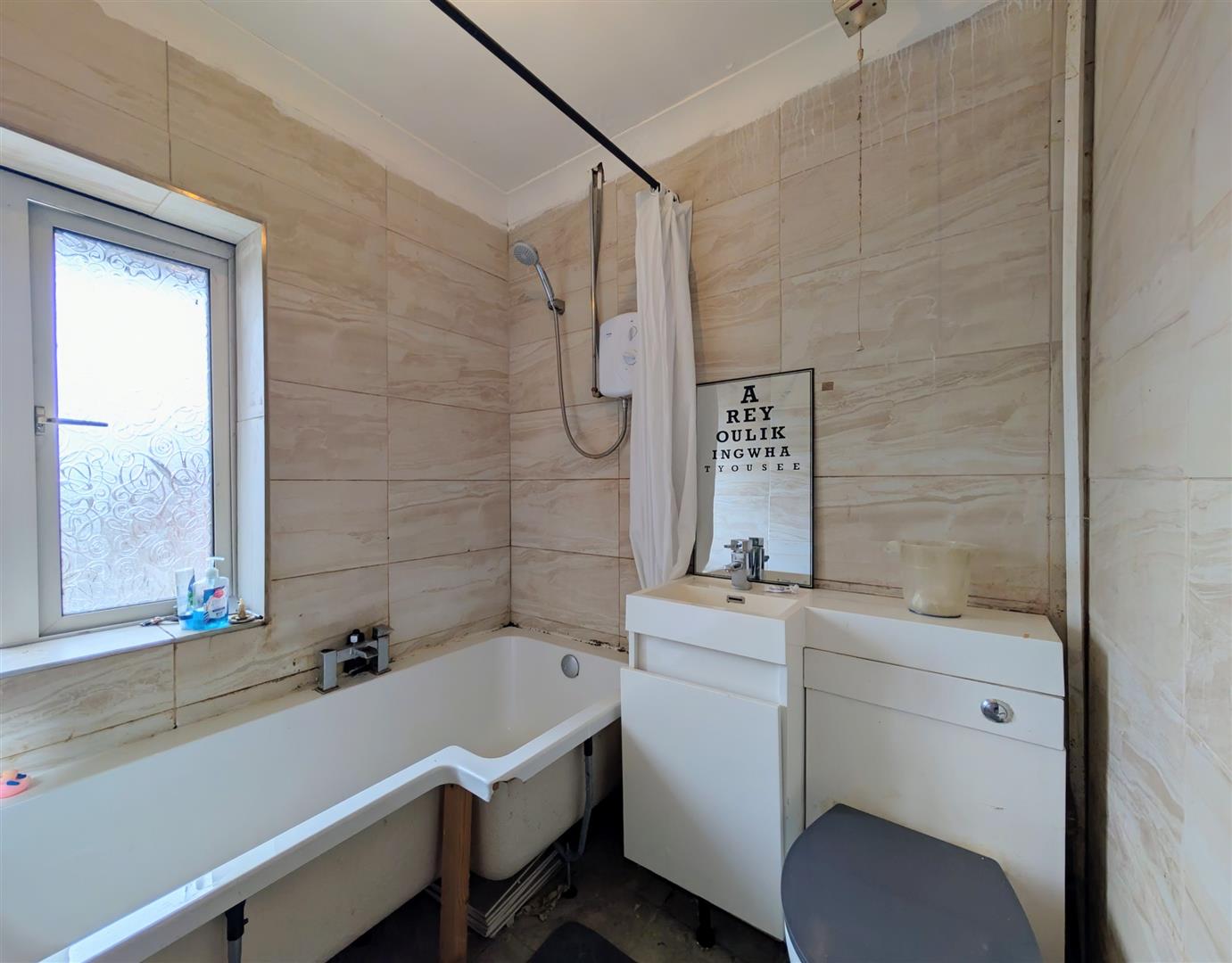 Bathroom - 1.91m x 1.85m (6'3 x 6'1) - White suite comprising bath with a mixer tap and shower unit over, low level w.c., wash hand basin with a mixer tap and cupboard below, fully tiled walls, chrome heated towel rail, tiled floor, upvc double glazed window to front elevation.