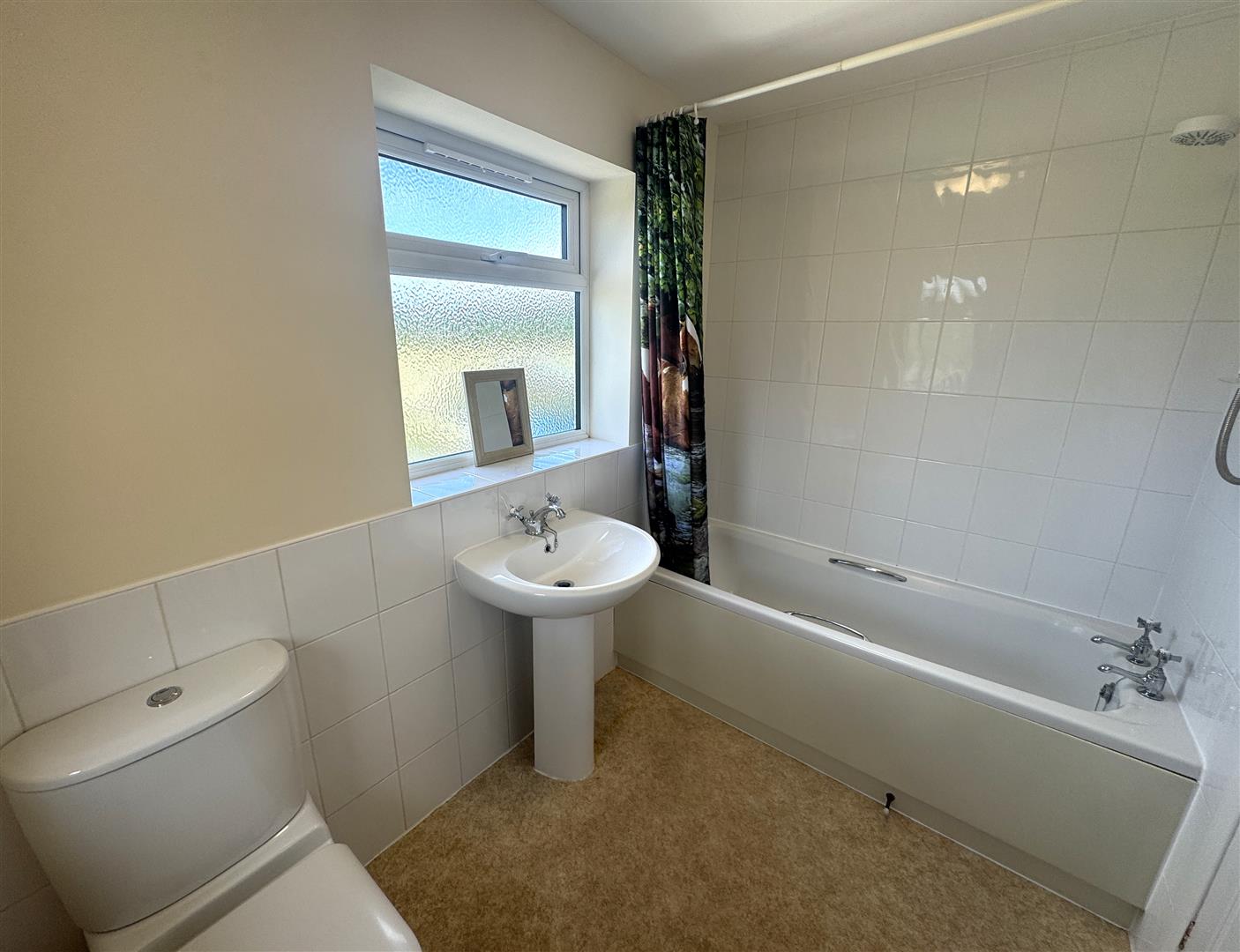 Bathroom - 2.51m x 1.68m (8'3 x 5'6) - White suite comprising modern panelled bath, electric shower over, tiled surround, pedestal wash hand basin with tiled splashback, close coupled WC, heated towel rail, front and side aspect frosted windows.