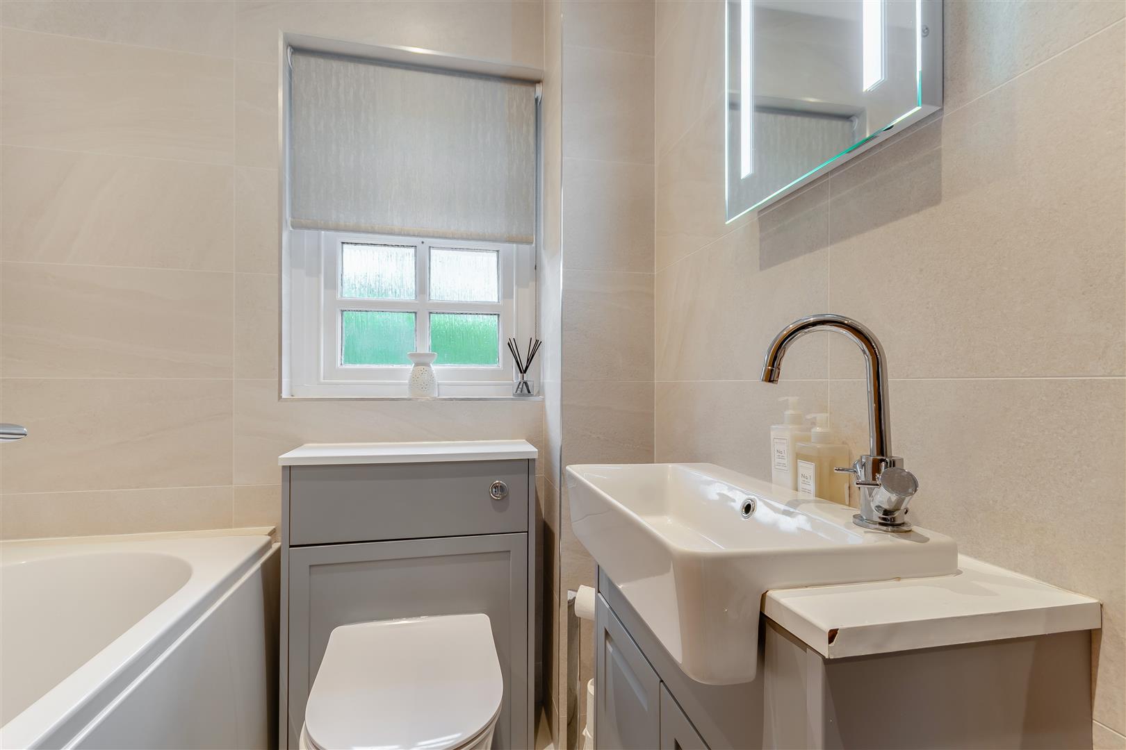Bathroom - White suite comprising of bath, low level WC, vanity wash hand basin with cupboards below, inset ceiling lights, extractor fan, side aspect frosted sash window.