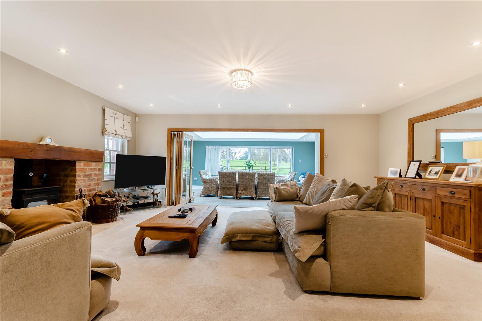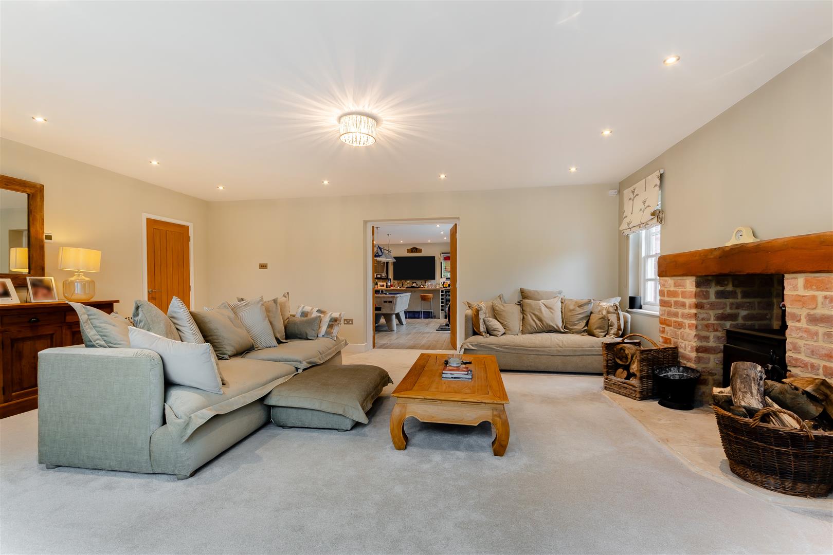 Living Room - 6.27m x 4.98m (20'7 x 16'4) - Beautiful brick fireplace, wood mantle and a stone hearth, inset wood burner, radiator, inset ceiling lights, two rear aspect double glazed sash windows, large oak bi-fold doors giving access into the dining room, double wooden doors into the sitting room.