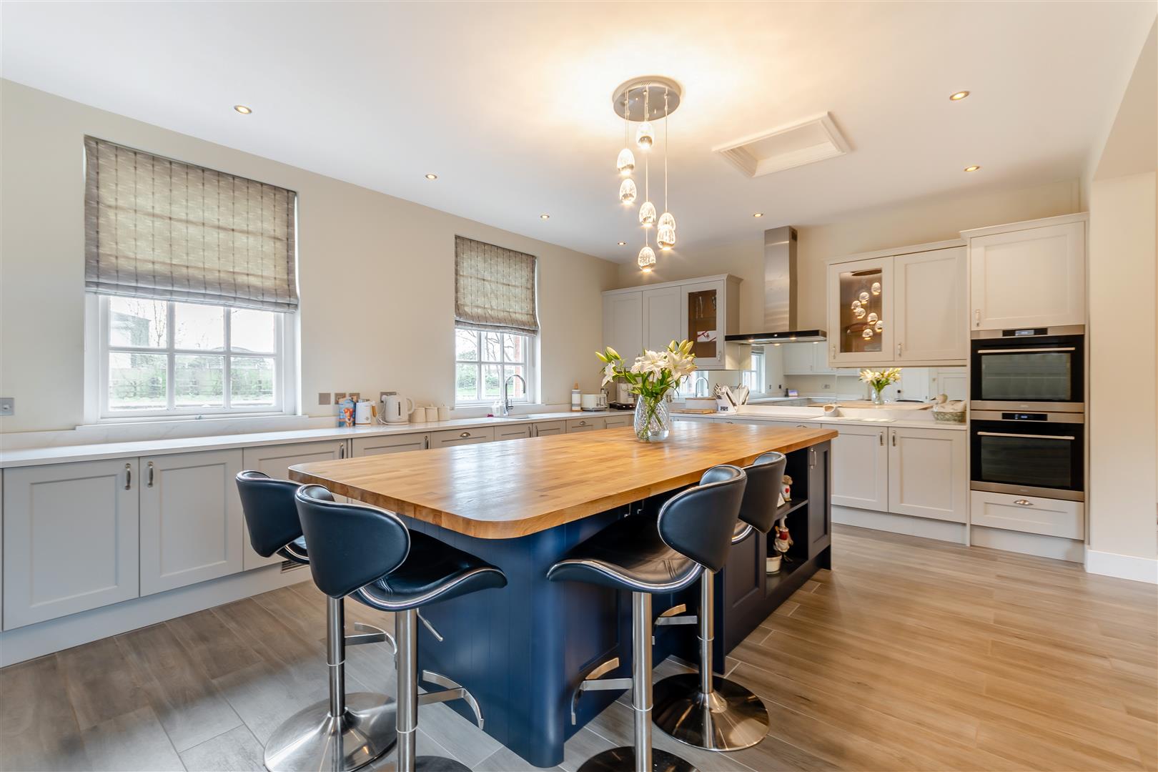 Kitchen / Family Room (L Shaped) - 7.54m x 6.43m max (24'9 x 21'1 max) - Shaker-style kitchen with wall, drawer and base mounted units, quartz worktops, large centre island with wooden worktop, seating and storage below, Belfast sink with Quooker tap over, two built-in ovens, built-in dishwasher, plumbing for washing machine, built-in fridge / freezer, large entertaining space, inset ceiling lights, two large front aspect double glazed sash windows and rear aspect double glazed sash window. Oak door to: