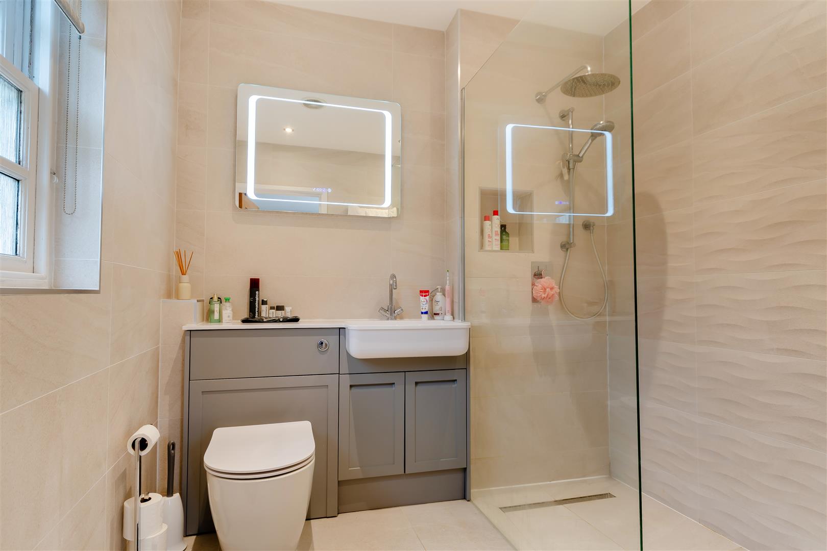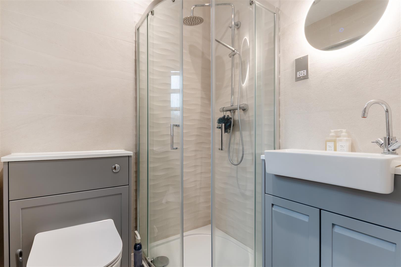 En-Suite - Low level WC, vanity wash hand basin with cupboard below, corner shower cubicle with rainfall shower head, inset ceiling lights, extractor fan, heated towel rail, tiled walls, tiled flooring, front aspect frosted sash window.