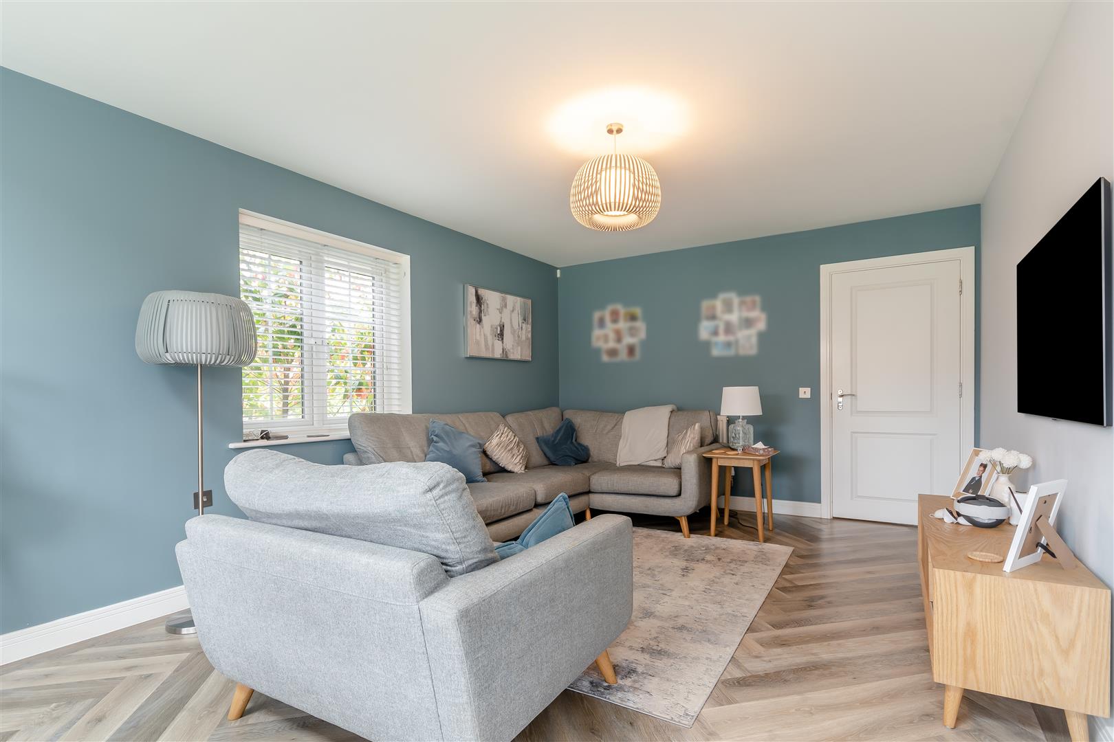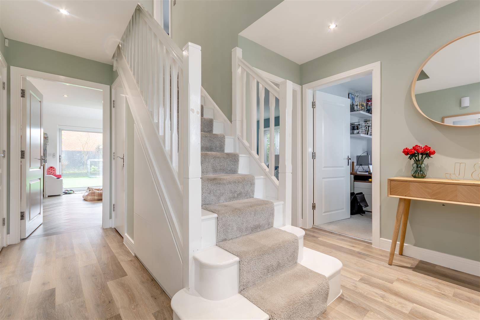 Entrance Hall - Power points, radiator, TV point, inset ceiling lights, door giving access to understairs cupboard having lots of storage and shoe rack, wooden door giving access into: