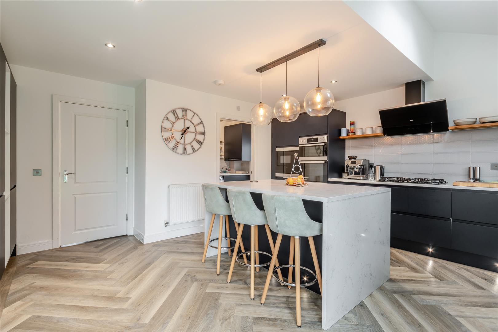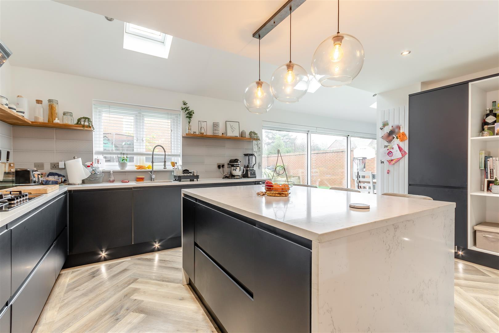 Kitchen - 4.88m x 4.57m (16'21 x 15'66 ) - Range of base, wall and drawer mounted units, five ring gas hob with extractor fan, large centre island with quartz worktop and space for seating, cupboards below to include two large slide out fridges, sink unit with mixer tap over, further quartz worktops, two built-in ovens and grill, built-in microwave, further built-in fridge and freezer, wine cooler, rear aspect UPVC double glazed window, Velux roof lights, Karndean flooring, power points, radiator, opens into the lounge, door into: