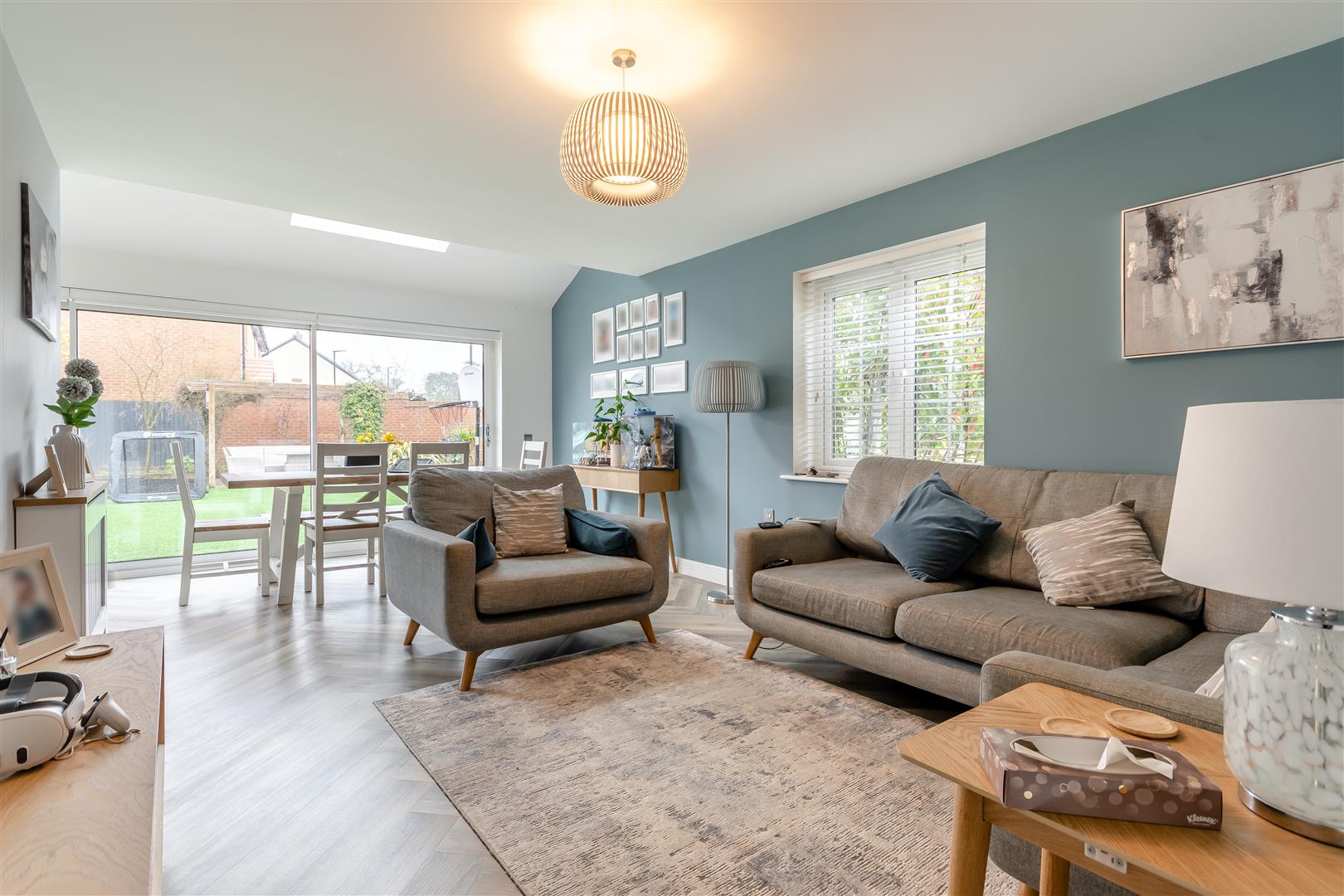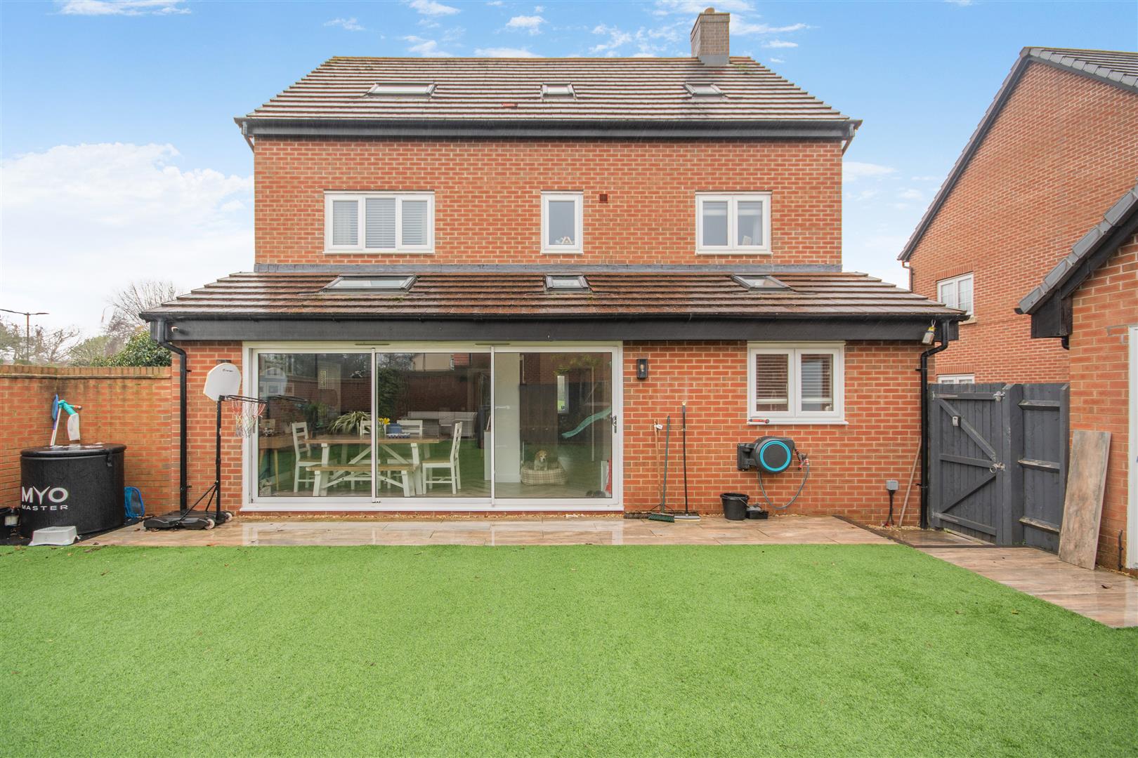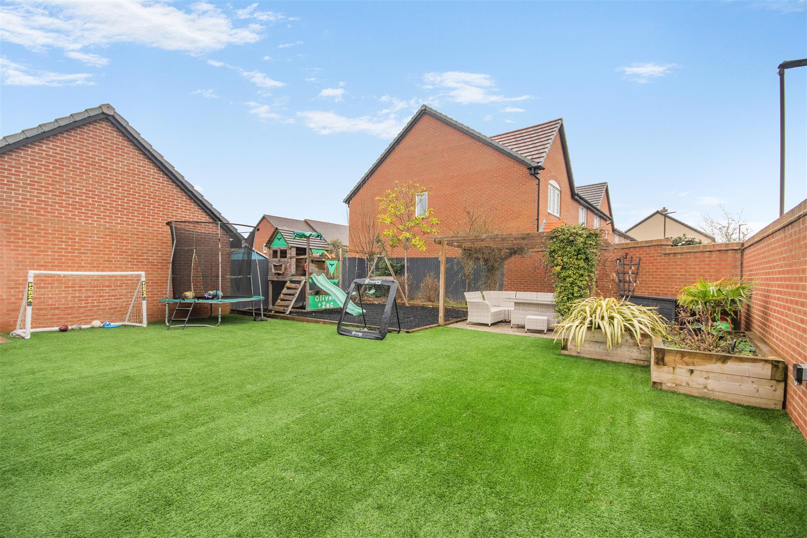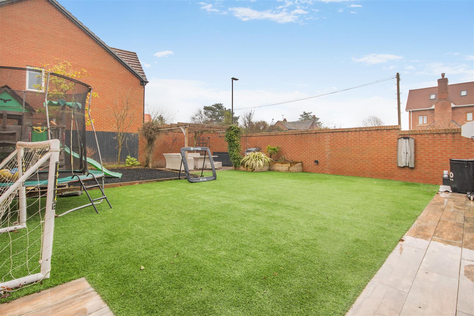 Outside - To the front of the property there is path leading to the front door with easy maintenance gardens to either side of the pathway. To the left of the property is off road parking suitable for five / six vehicles, which leads up to the double garage. A side gate gives access into the rear easy maintenance garden having a large Astro turf area, raised flower beds, tiled floor seating / BBQ area, kids play area with wood chips, flower boarder, all enclosed by fencing and walling.