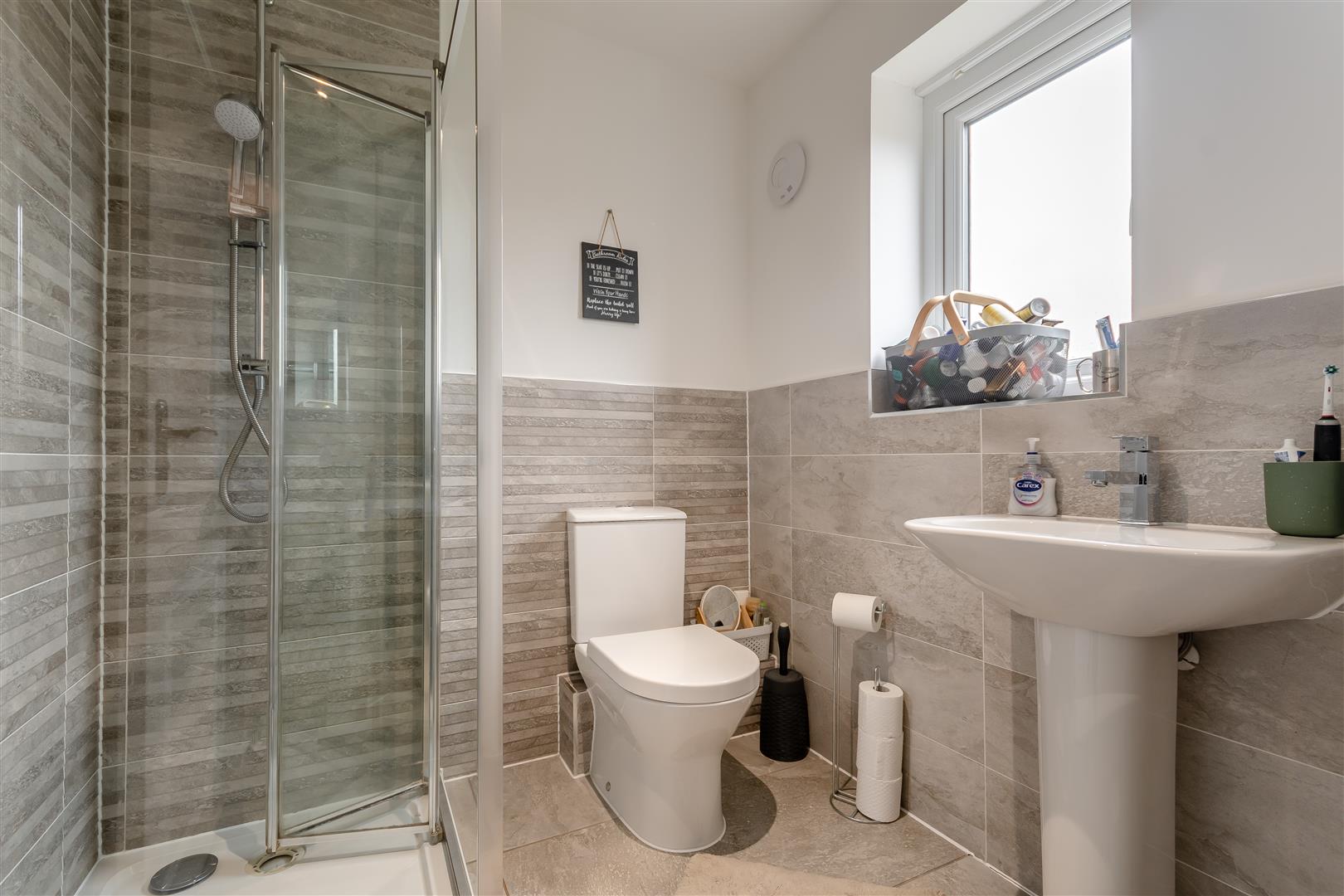 En-Suite - 2.74m x 2.74m (9'91 x 9'37) - Shower cubicle with rainfall head shower, low level WC, pedestal wash hand basin, partly tiled walls, inset ceiling lighting, rear aspect frosted UPVC double glazed window, tiled flooring, heated towel rail.