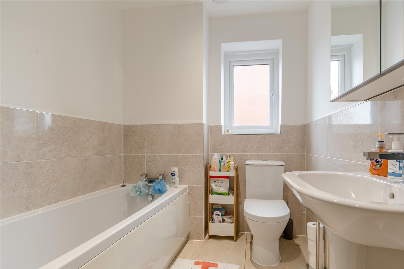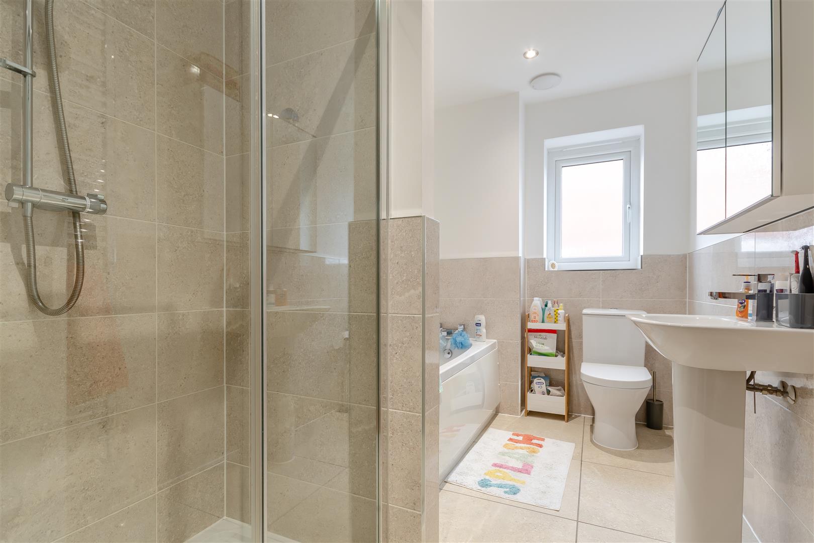 Bathroom - White suite comprising of panelled bath, low level WC, pedestal wash hand basin, double shower unit with rainfall head over, inset ceiling lights, partly tiled walls, tiled flooring, heated towel rail, extractor fan, side aspect frosted UPVC double glazed window.