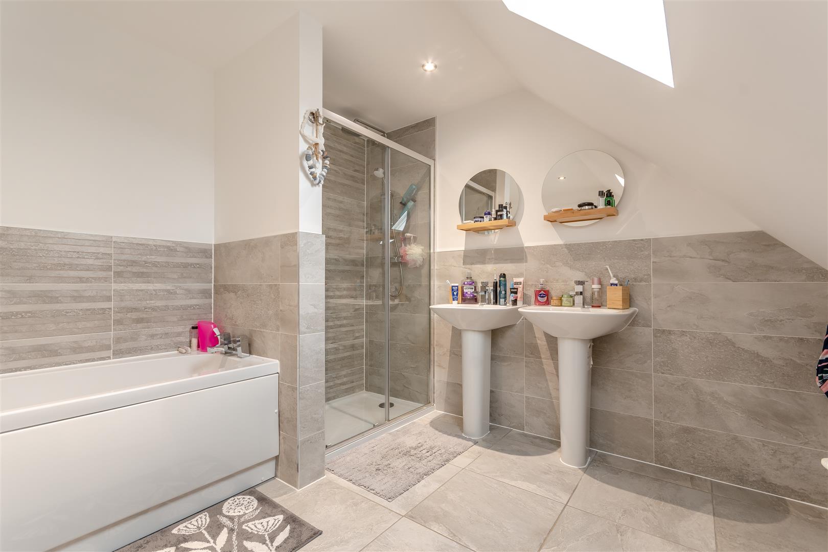 En-Suite - 2.74m x 2.74m (9'91 x 9'37 ) - Suite comprising of panelled bath, his and hers sinks, low level WC, double shower unit with rainfall shower over, two heated towel rails, inset ceiling lights, extractor fan, rear aspect Velux roof light.