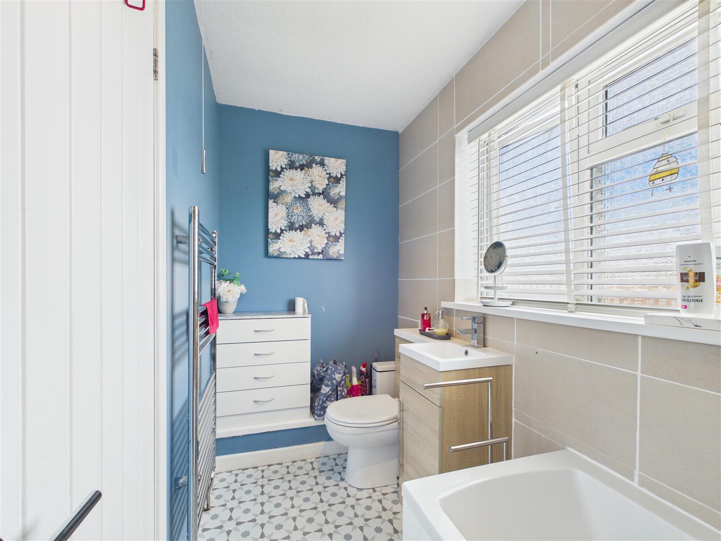 Bathroom - 1.37m x 3.18m (4'6 x 10'5) - White suite with concealed cistern w.c, vanity wash hand basin, monobloc mixer tap over, modern side paneled P shaped bath, electric shower fitted over, conventional and drencher head, half tiled walls, chrome heated towel radiator, directional ceiling spots, front aspect upvc obscure double glazed window.