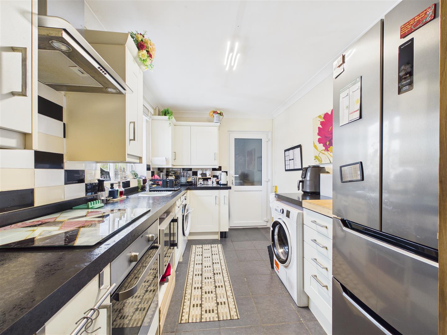Kitchen - 2.31m x 3.99m (7'7 x 13'1) - Single bowl, single drainer, stainless steel sink unit with monobloc mixer tap over, rolled edge worktops, range of base and wall mounted units, matching upstands, tiled surrounds, four-ring induction hob, electric oven beneath, extractor hood over, space and plumbing for dishwasher and washing machine, space for fridge/freezer, space for tumble dryer, tiled flooring, single radiator, ceiling light, coving, small door giving access to larder cupboard, front aspect upvc double glazed window overlooking the parking area with views towards fields and countryside in the distance. Access into: