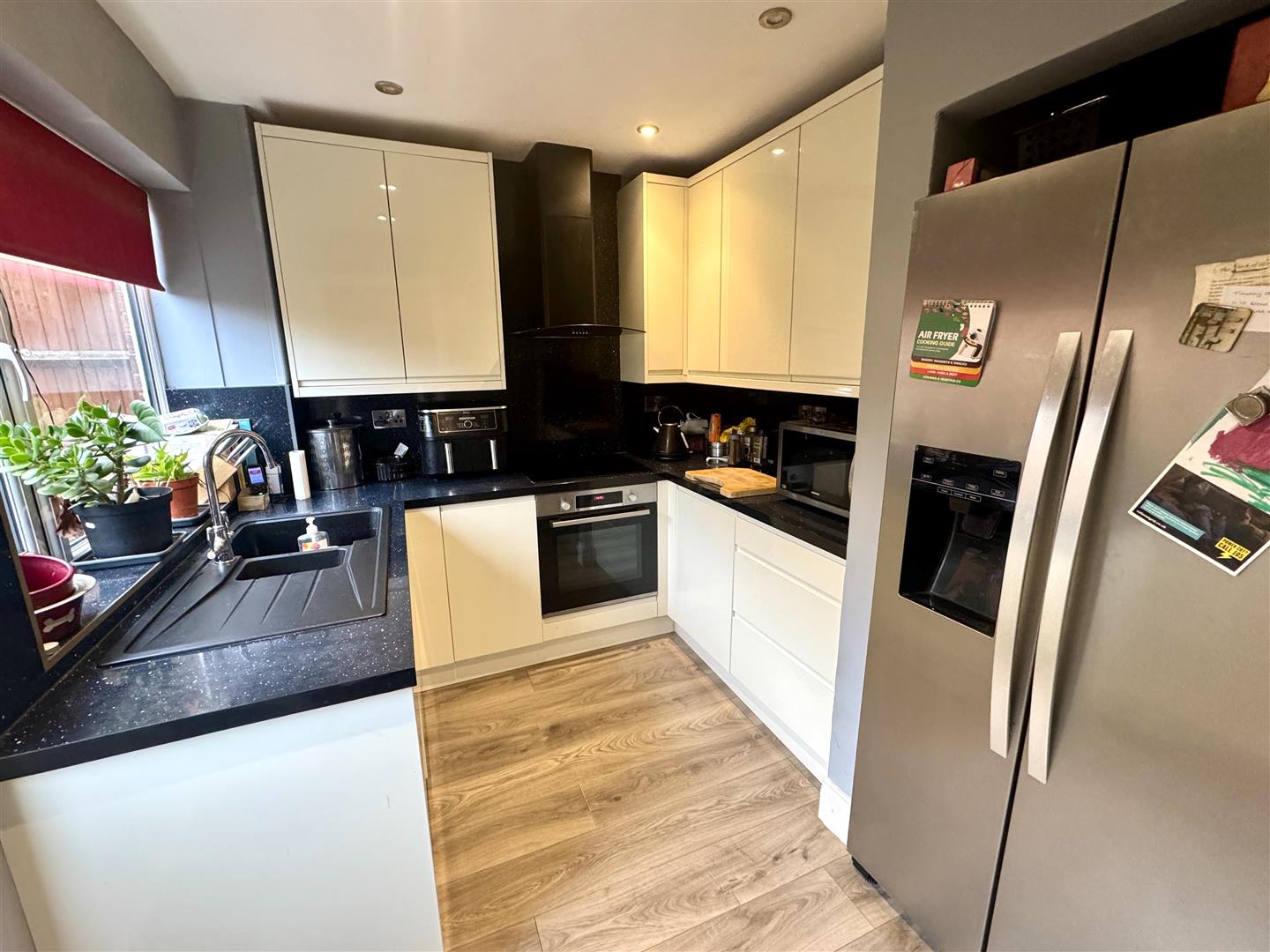 Kitchen - 2.87m x 2.36m (9'5 x 7'9) - Newly fitted to comprise one and a half bowl single drainer sink unit with mixer tap, cupboards under, range of base and wall mounted units, fitted electric oven, four ring hob over, cooker hood above, space for American fridge / freezer, rear aspect window, half glazed door through to the outside.