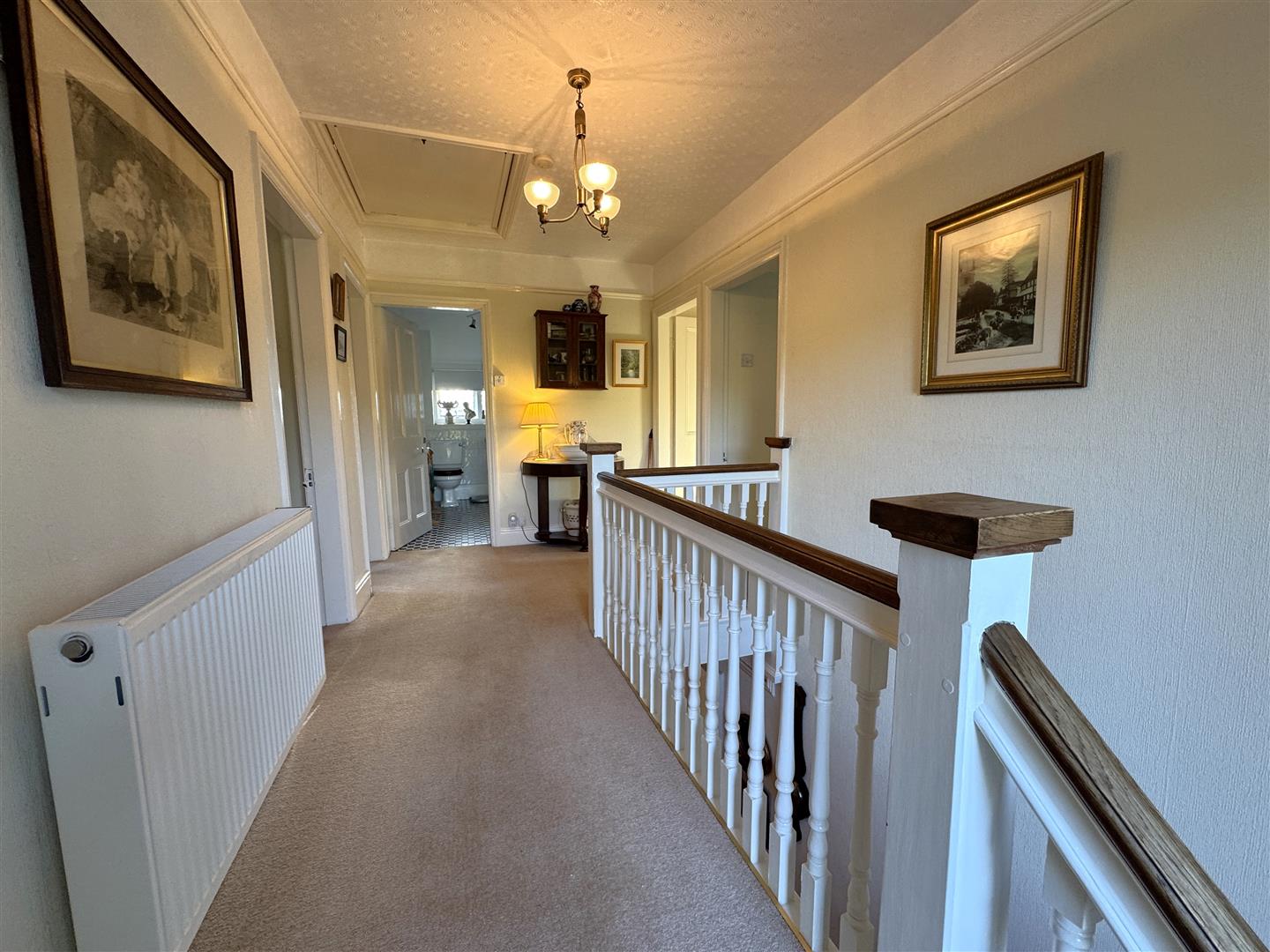Split Landing - Double radiator, access to roof space, picture rail, steps and french doors to the front wrap around balcony enjoying lovely views over countryside towards May Hill. Door to: