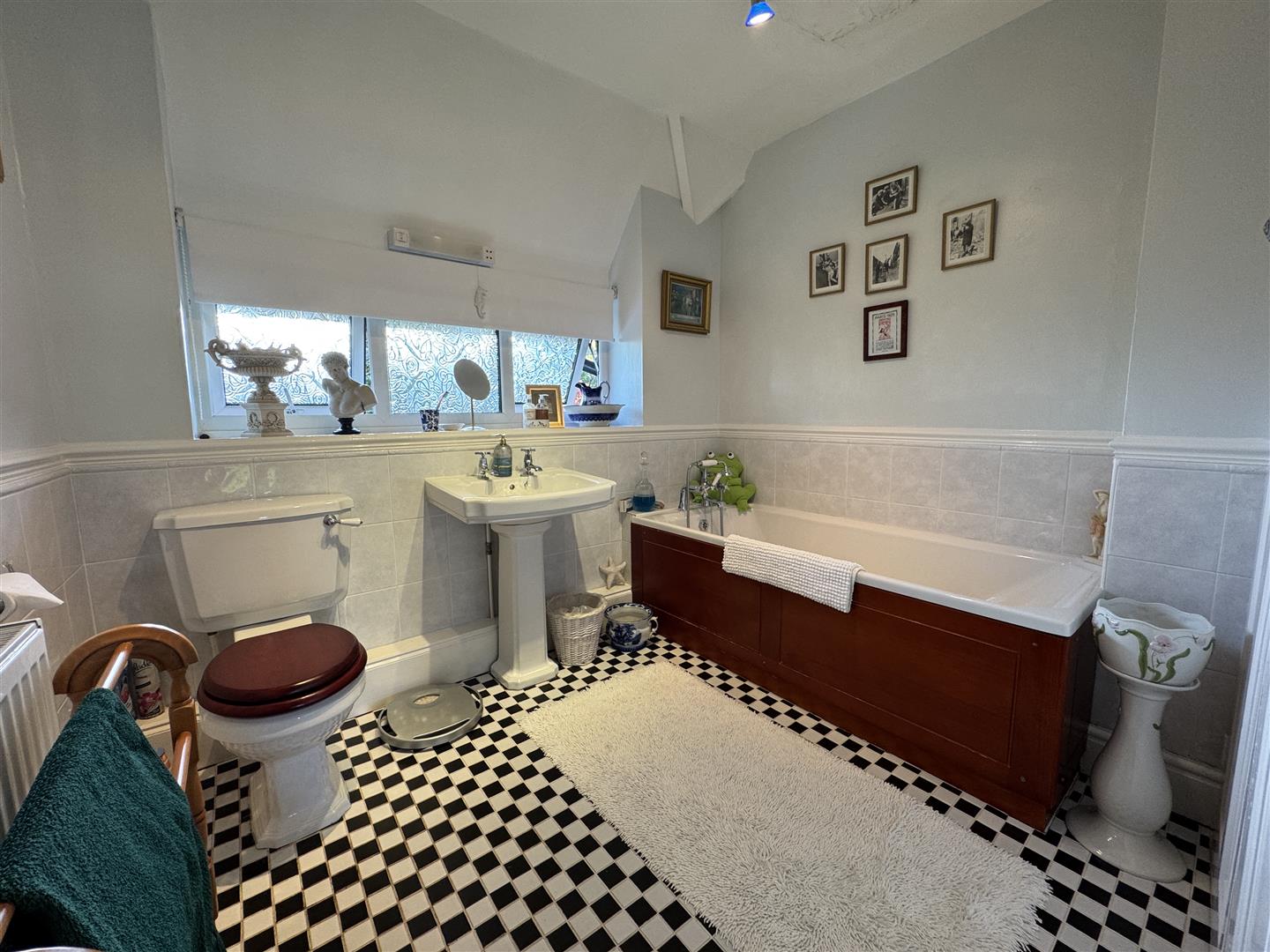 Family Bathroom - 2.62m x 2.62m (8'07 x 8'07) - White suite comprising wooden panelled bath with shower mixer taps, pedestal wash hand basin, w.c., tiled flooring, airing cupboard with hot water tank, slatted shelving and storage, double radiator, rear aspect frosted window.