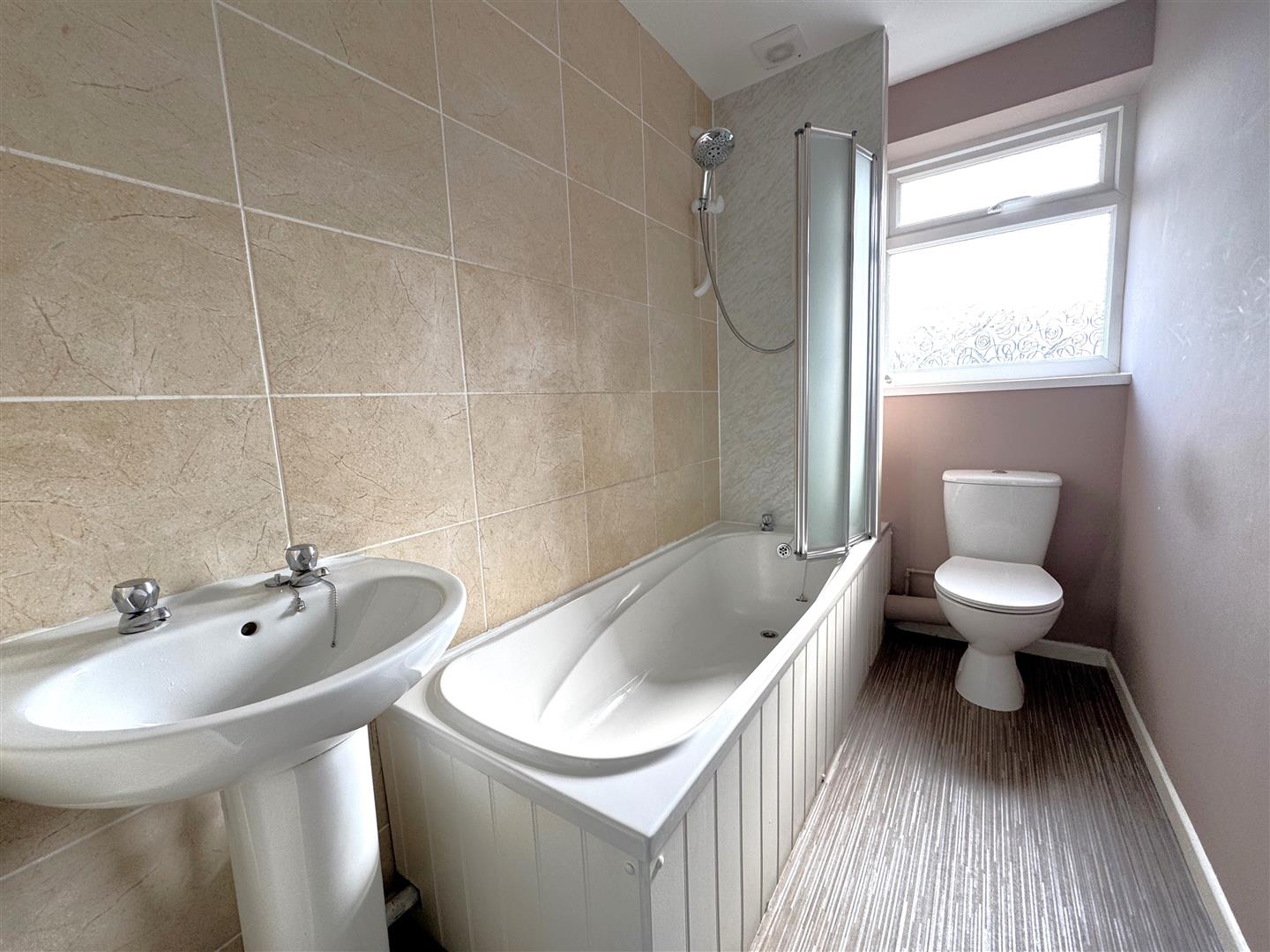 Bathroom - 2.57m x 1.40m (8'5 x 4'7) - Panelled bath with Triton electric shower over, wc, wash hand basin, tiled splashbacks, extractor fan, rear aspect frosted window.