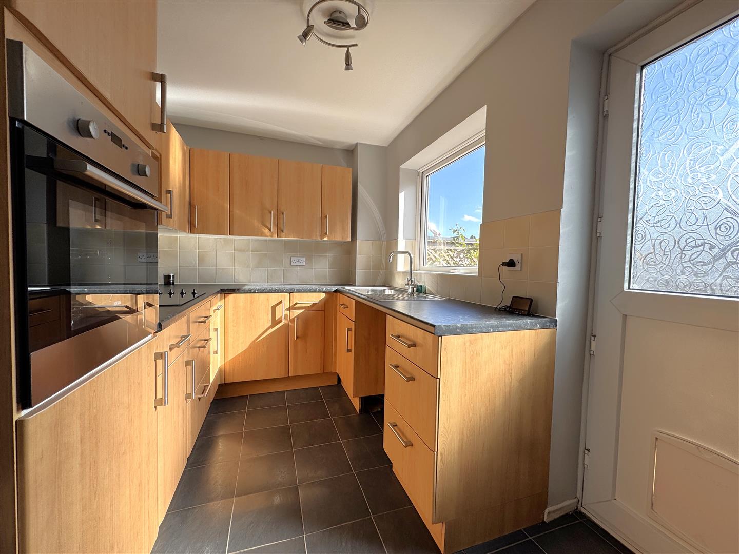 Kitchen - 3.56m x 2.13m (11'8 x 7') - Modern kitchen comprising a range of base and wall mounted units with laminated worktops and tiled splashbacks, integrated oven with four ring Halogen hob, space for washing machine under the counter, single drainer mixer tap, rear aspect window, half glazed upvc back door.