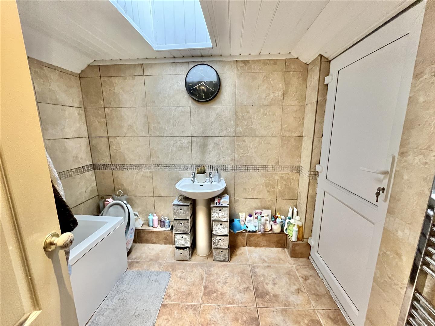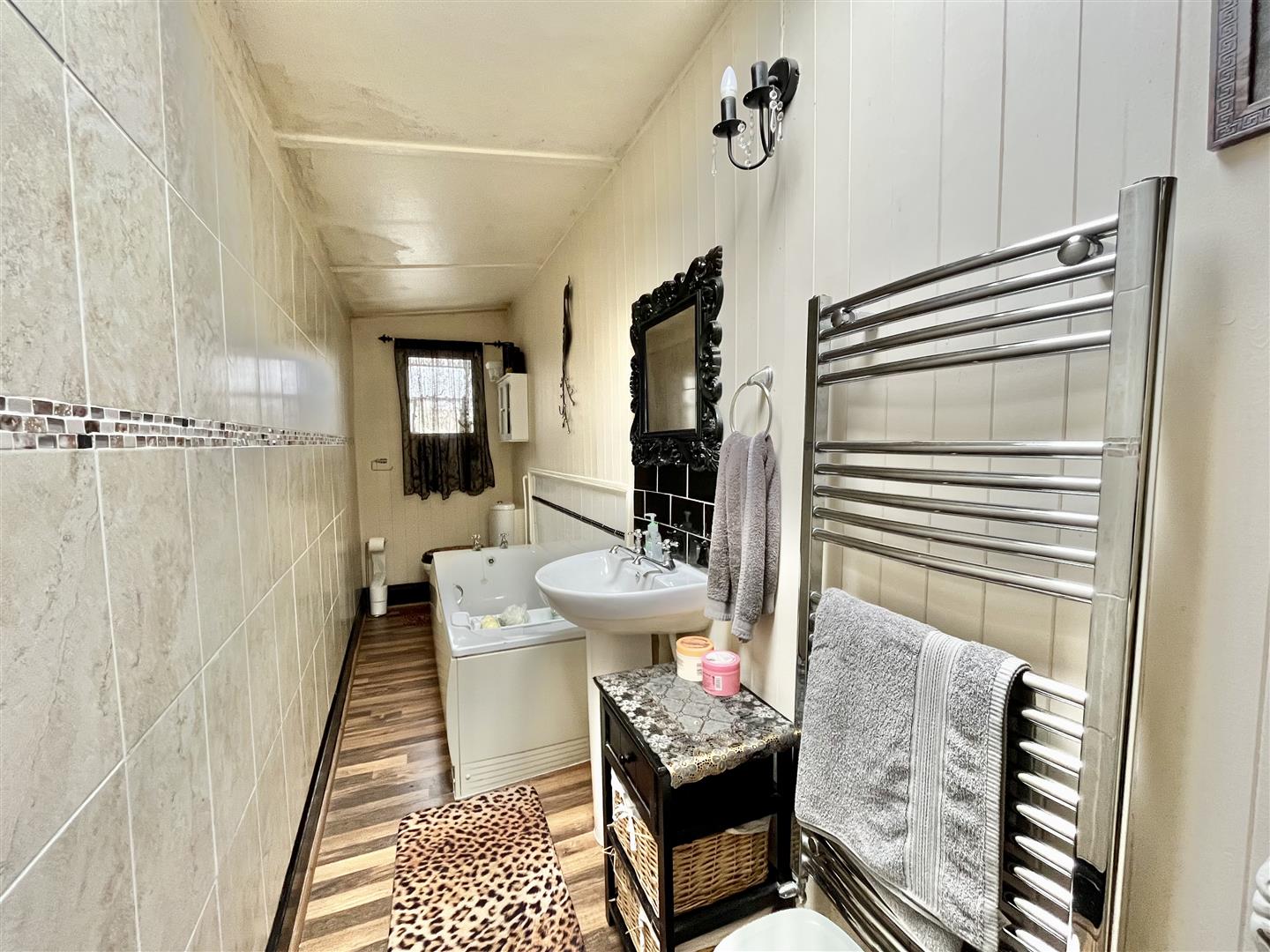 Bathroom - 5.94m x 1.09m (19'6" x 3'7") - Bath with tiled splashbacks, low level wc, pedestal handbasin with tiled splashbacks, heated towel rail, windows to both side aspects and skylight.