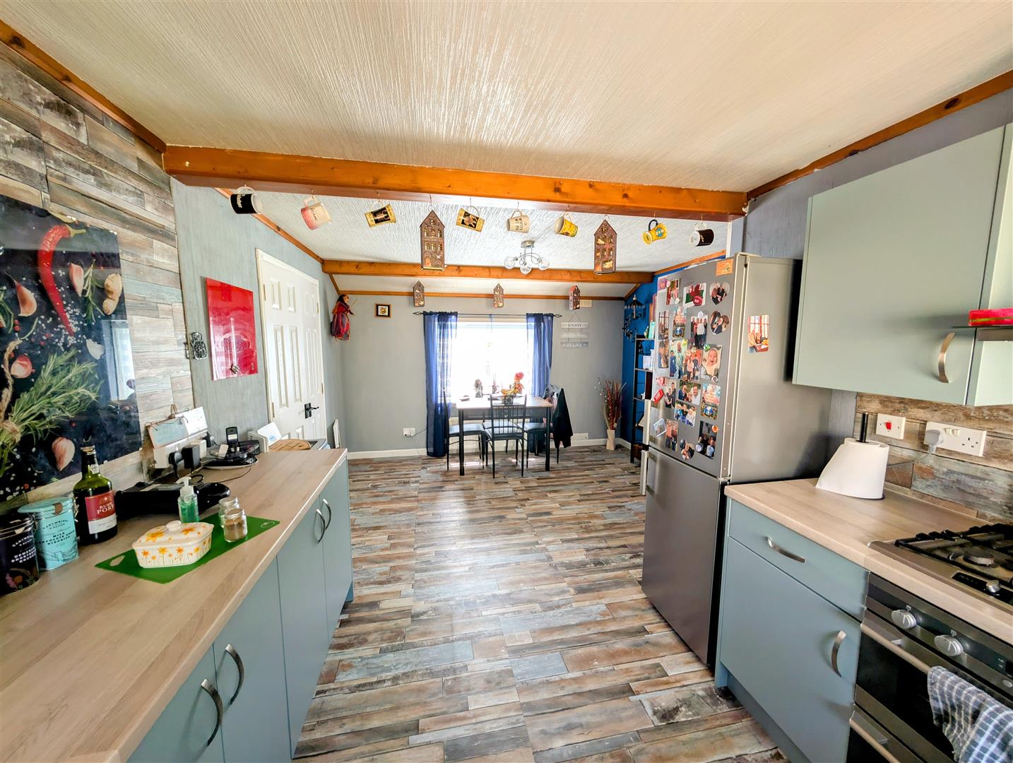 Kitchen - A modern kitchen comprising of wall, drawer and base mounted units, four ring gas hob with extractor fan above, oven and grill, one and a half bowl single drainer stainless steel sink unit with mixer tap above, side aspect double glazed upvc window, power points.