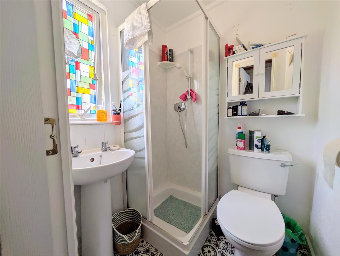 En-Suite - 1.45m x 1.32m (4'09 x 4'04) - Walk in shower unit with shower off the mains, wash hand basin, WC, front aspect double glazed upvc frosted stained glass window, radiator.