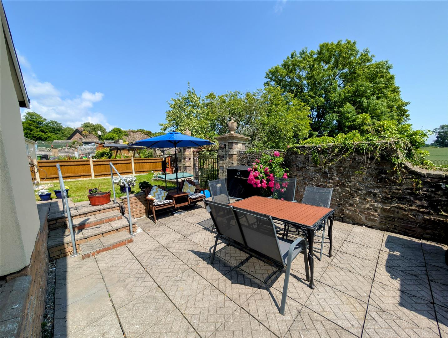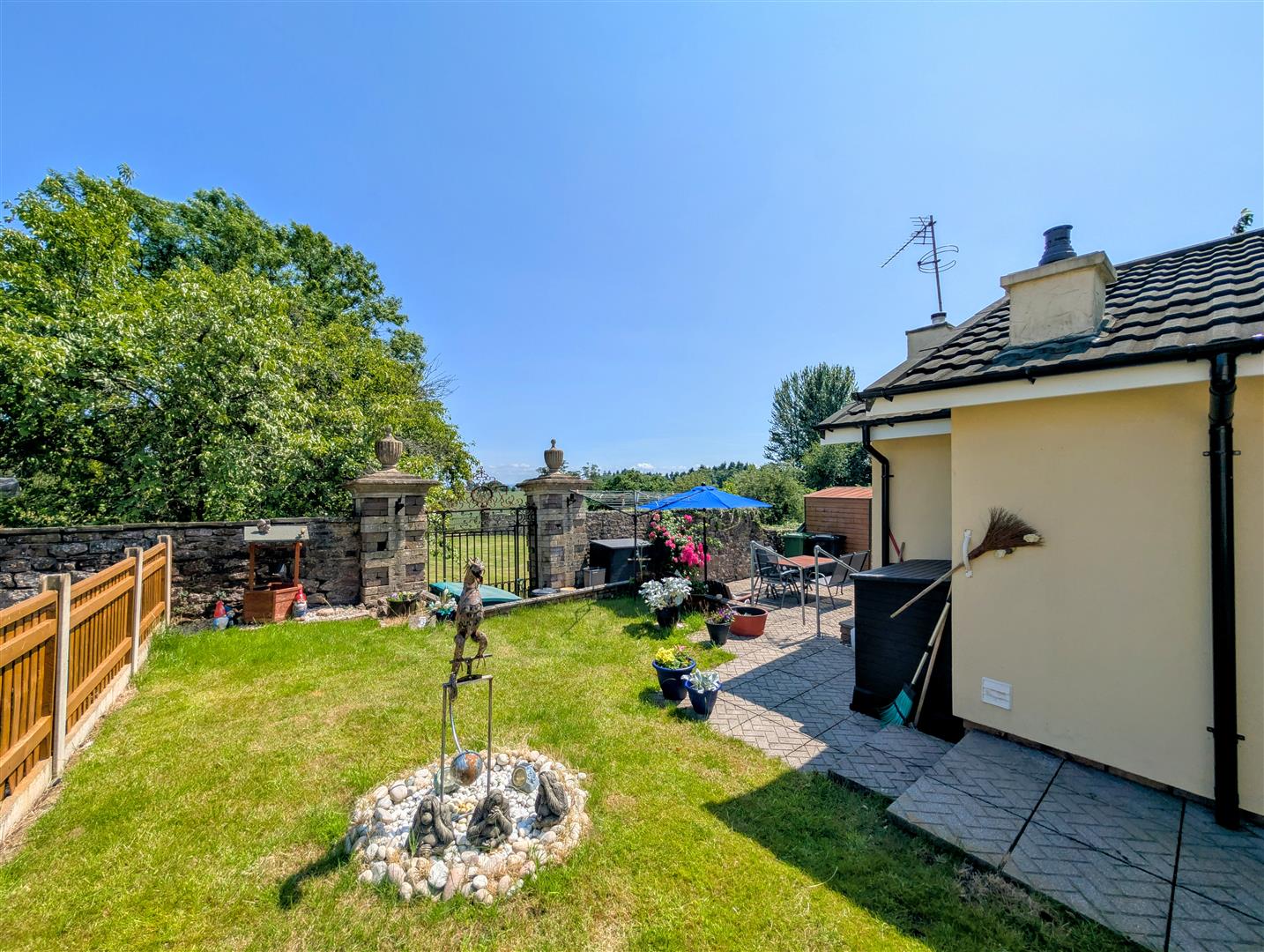 There is a wrap around garden which comprises of a patio area, lawned area and a lovely view of the countryside, all enclosed by fencing and walls.