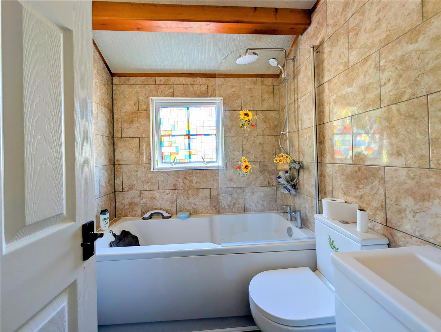 Bathroom - 1.75m x 1.98m (5'09 x 6'06) - Side aspect double glazed upvc frosted stain glass window, bath with bath taps over and a rainfall shower above, wash hand basin unit with mixer tap, WC, heated towel rail.
