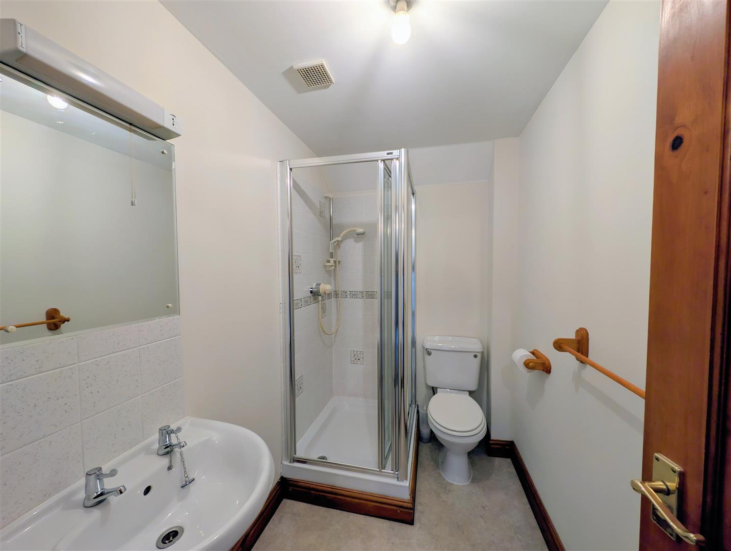 Shower Room - 2.46m x 1.45m (8'01 x 4'09) - Comprising WC, pedestal wash hand basin with tiled splashback and shower enclosure with mains-fed shower and tiled surround. Radiator.