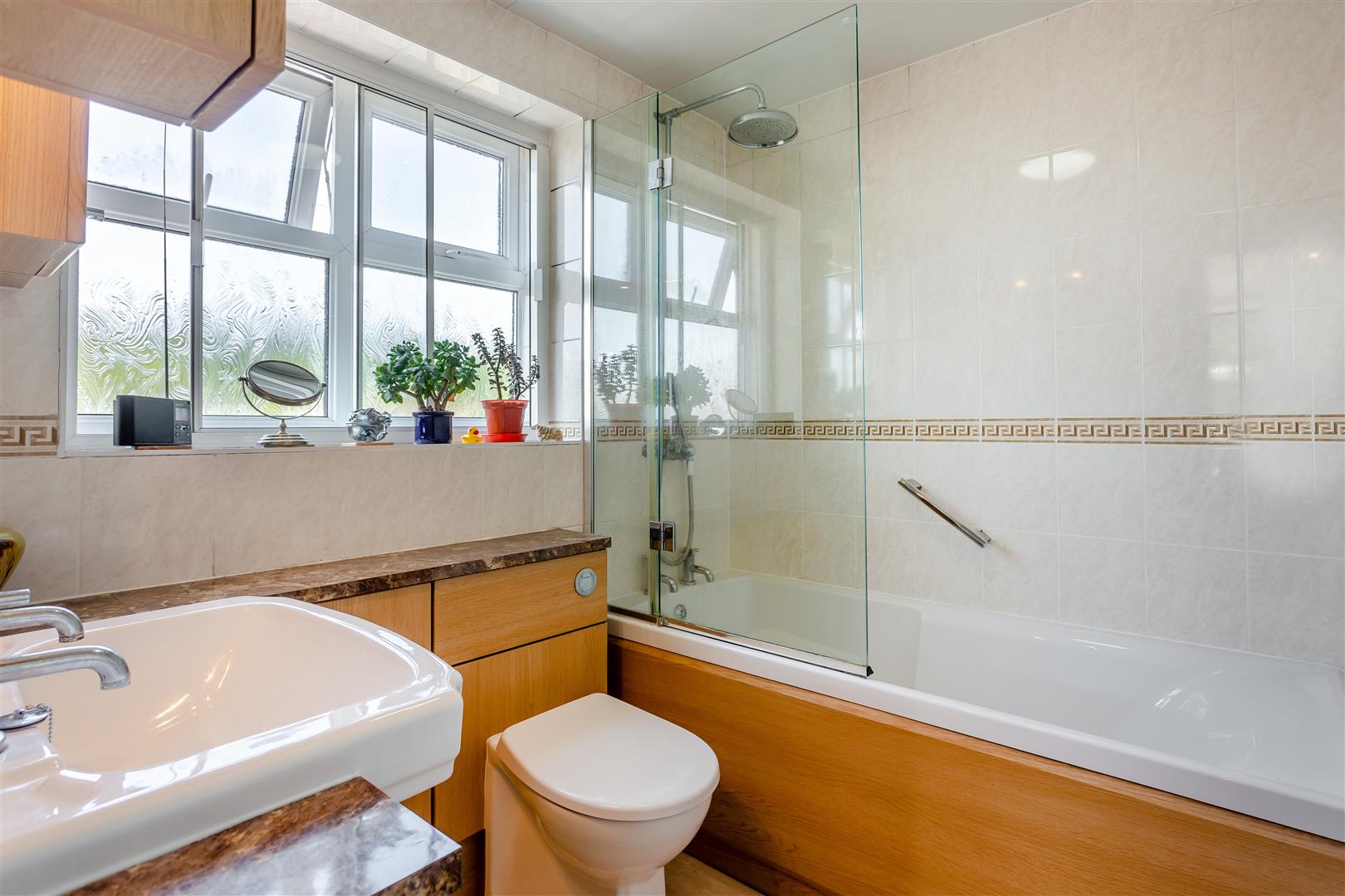 Bathroom - 1.85m x 2.11m (6'01 x 6'11) - Panelled bath with mains shower over and tiled surround, W.C, vanity wash hand basin, heated towel rail, tiled walls, side aspect upvc double glazed frosted window.