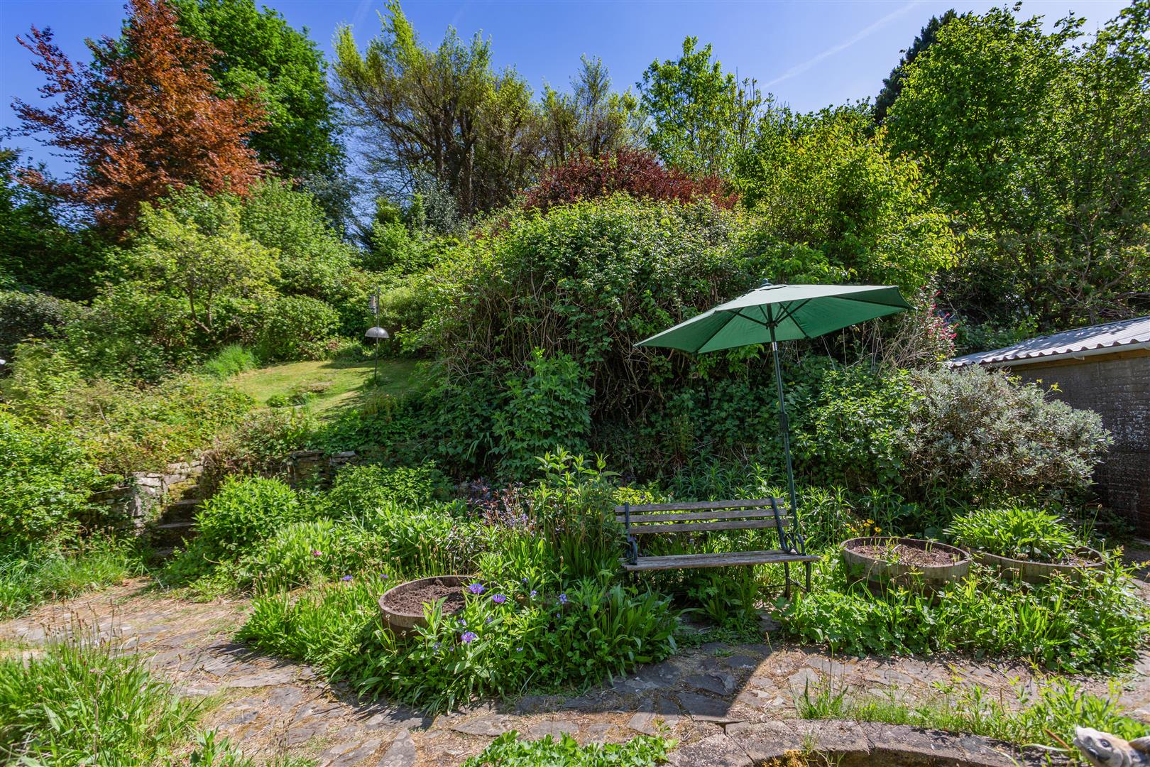 A variety of meandering pathways lead gently up the sloping garden, revealing a series of inviting seating areas tucked into both sunny clearings and peaceful, shaded corners beneath mature trees. It's an ideal setting for relaxing, entertaining, or simply soaking up the sights and sounds of nature.