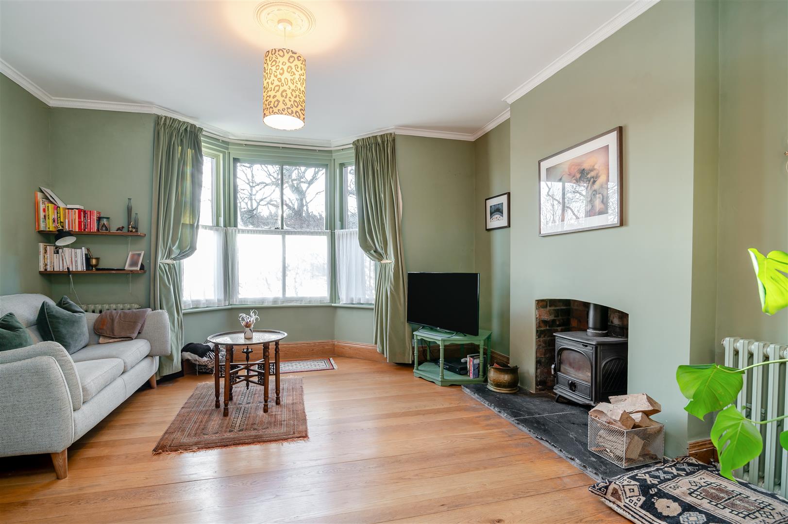 Sitting Room - 4.27m x 4.32m (14'00 x 14'02) - Featuring a bay window to the front, a feature brick fireplace with inset wood-burning stove and oak flooring flowing through to the dining area.
