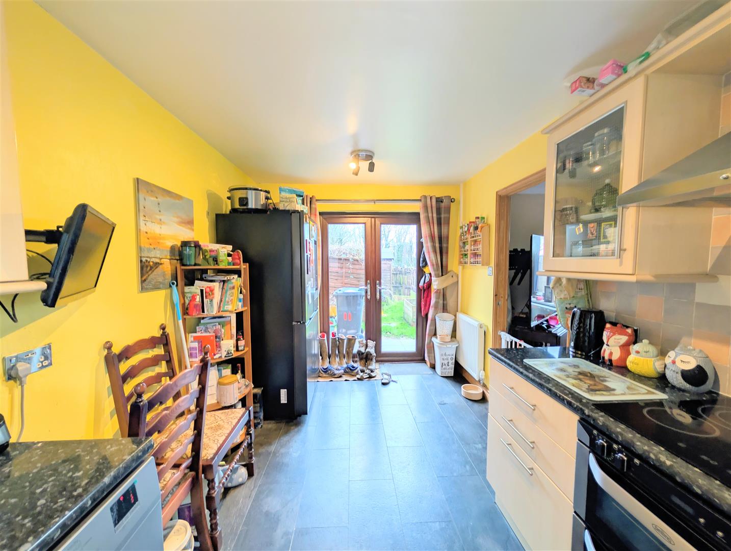 Kitchen/Diner - Fitted with a range of units at eye and base level with worktop surfaces. Built in cooker with extractor hood above, sink unit with drainer, plumbing for washing machine and tumble dryer and space for a freestanding fridge/freezer. Wall-mounted boiler, tile-effect flooring, front-facing double-glazed windows and French doors opening directly onto the rear garden. Ample space for a dining table and chairs.
