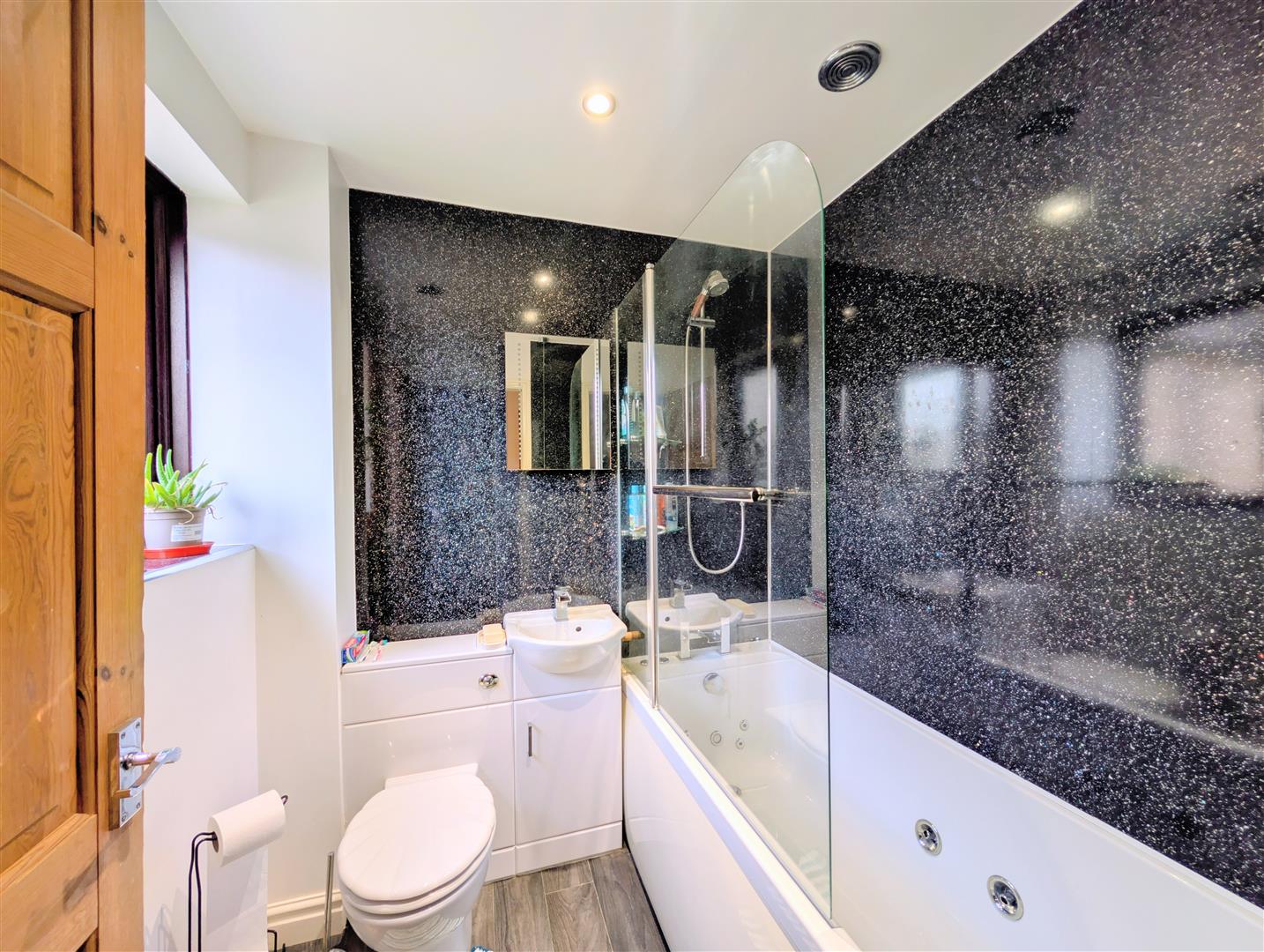 Bathroom - Fitted with a WC, wash hand basin with vanity unit and whirlpool-style panelled bath with shower attachment. Wood-effect flooring and front-facing double-glazed window.