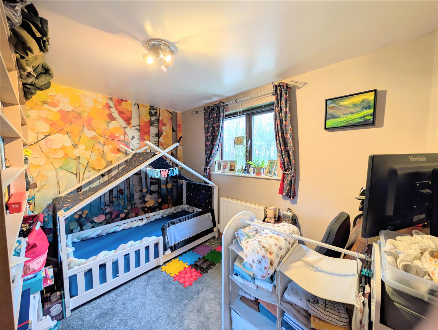 Bedroom One - A generous double bedroom with carpeted flooring, radiator, large walk-in storage cupboard and rear-facing double-glazed window overlooking woodland.